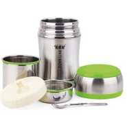 The stainless steel flask keeps food hot for 12 hours in a safe and clean vacuum less environment. It is high quality steel and easy to carry anywhere since it posses an upper handle.