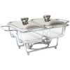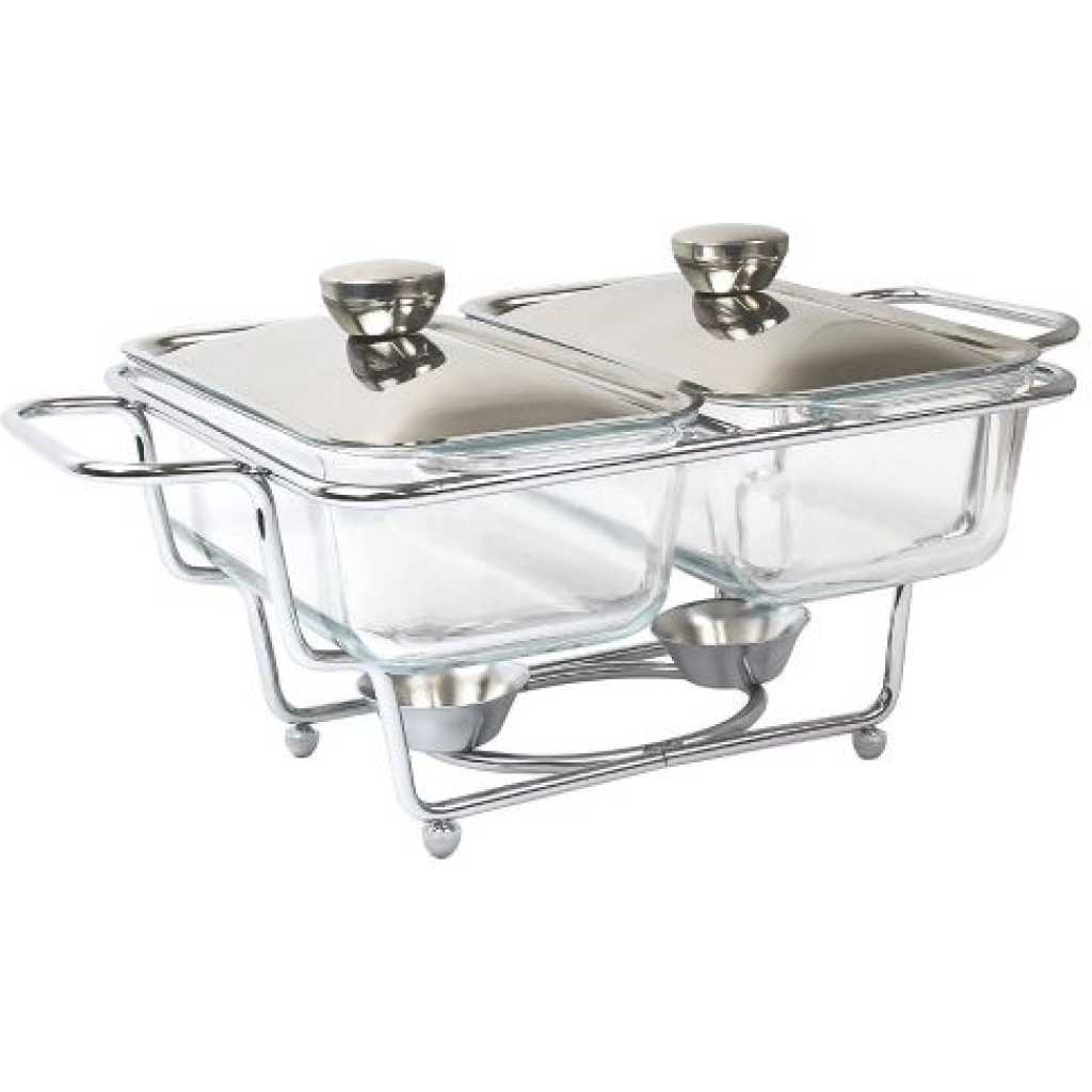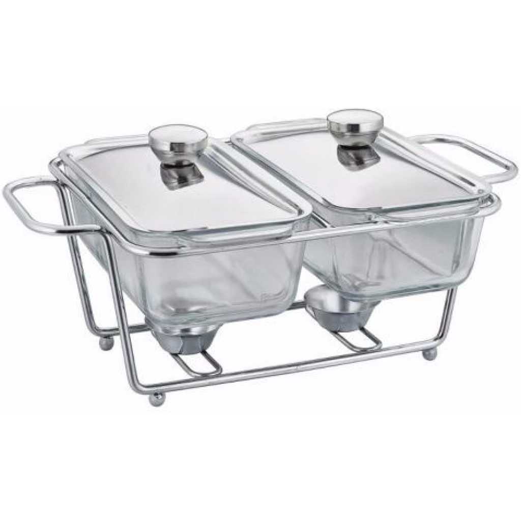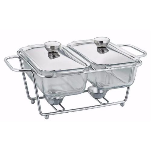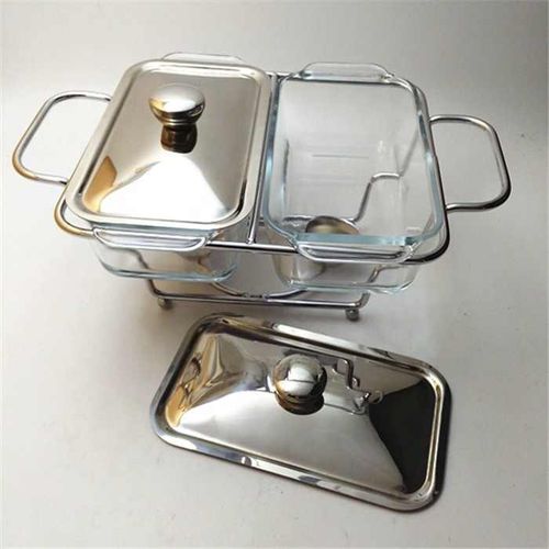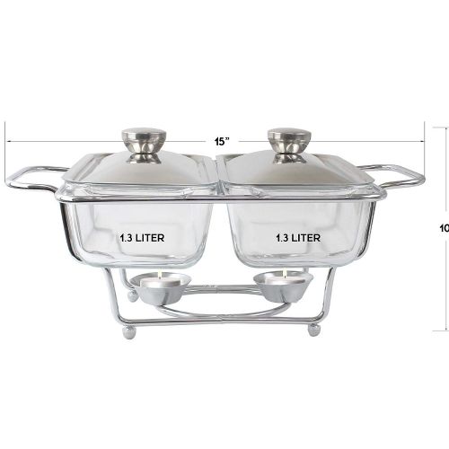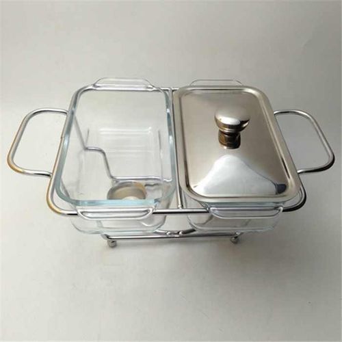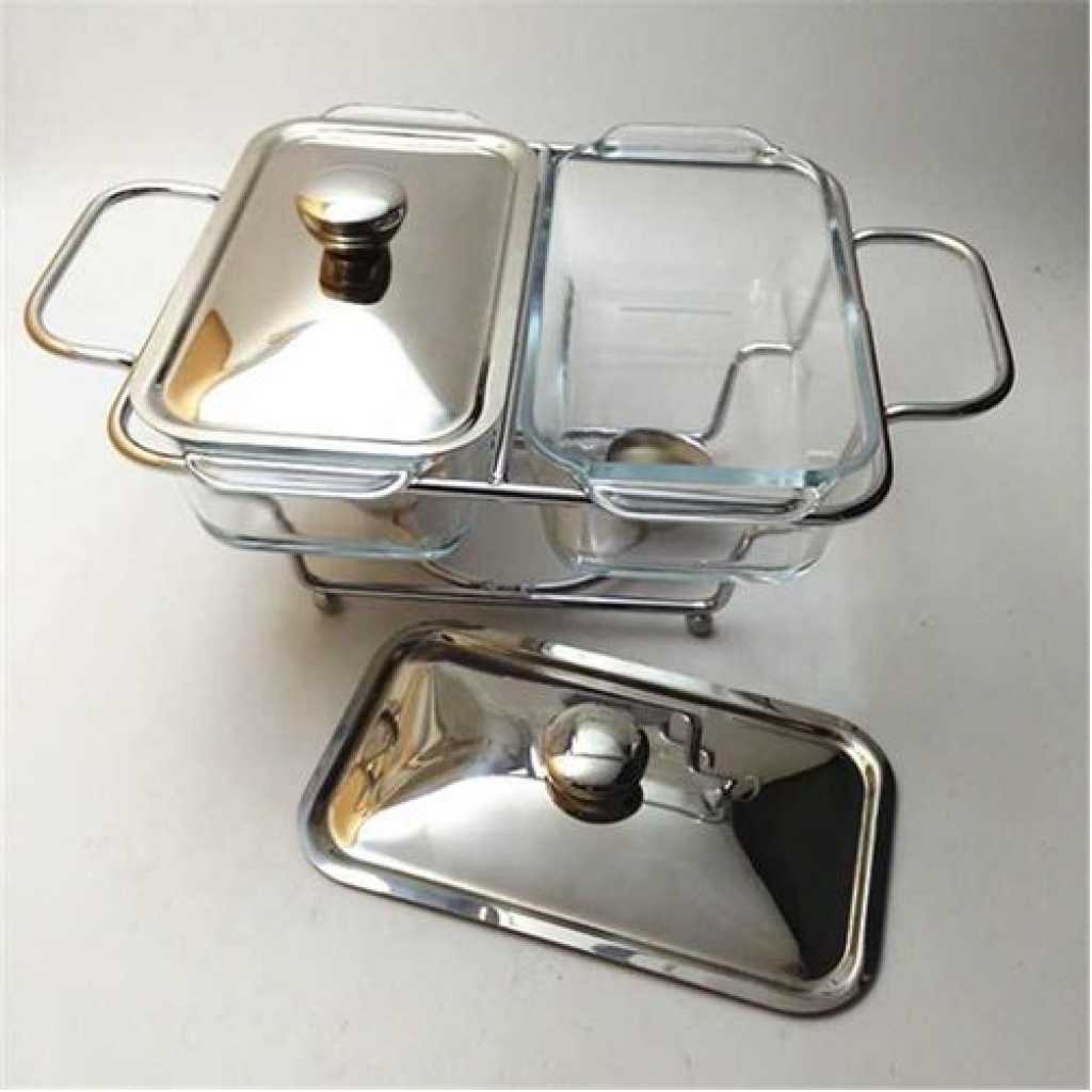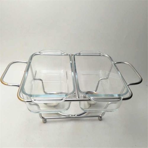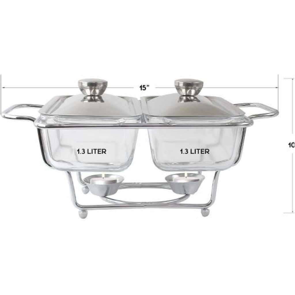 1.3L Multi-purpose Double Glass Chafing Dish Buffet Food Warmers- Clear. Use Soup Warmer to warm up your family’s favorite dishes. This warmer comes with a supporting leg, as well as a candle holder to ensure that the soup is kept warm as it is served. The container is made of quality heat-resistant glass, with stainless steel legs. Key Features: 1.3L Multi-purpose Double Glass Chafing Dish Buffet Food Warmers- Clear. Tea light candles provide heat to keep food at proper serving temperatures Resists stains and hence is easy to clean The well-contoured handle offers a comfortable grip Bowl material: glass Stainless steel support legs