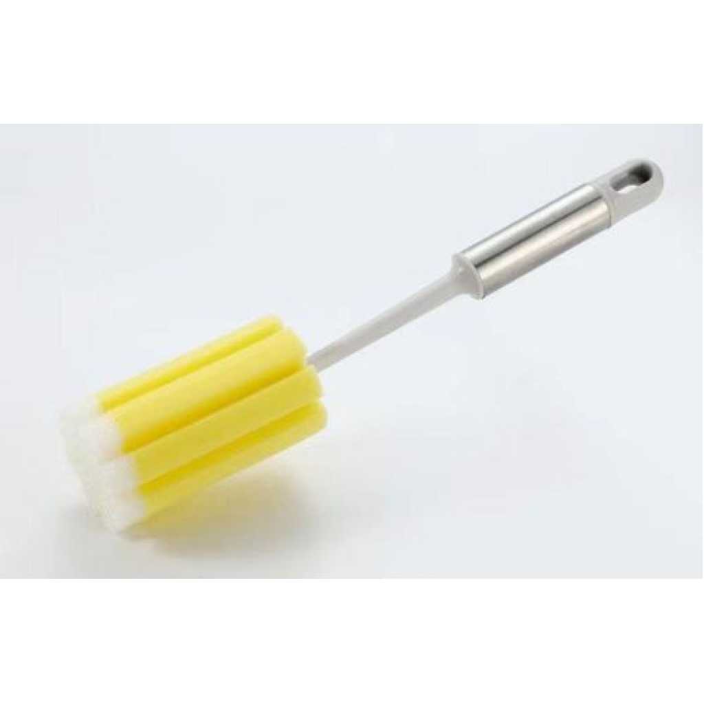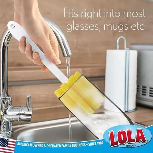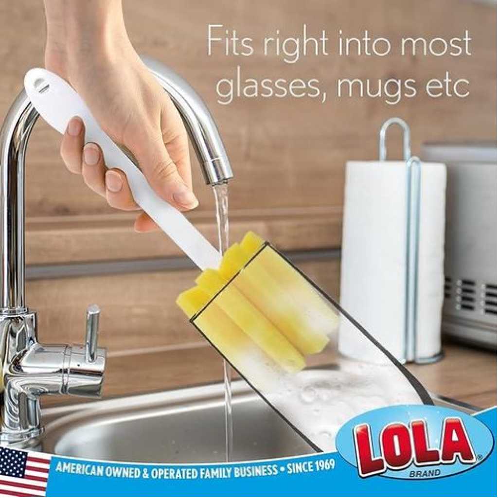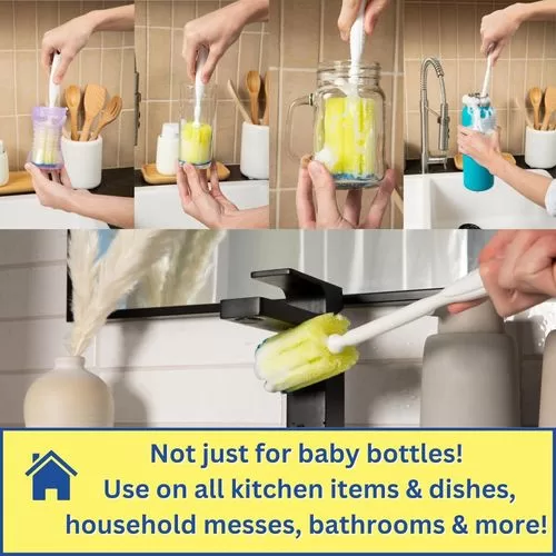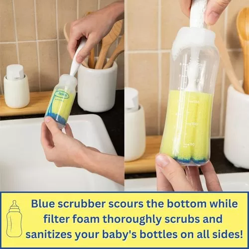 Key Features: LONG-HANDLED SPONGE & SCRUBBER: 10 inches long from handle to scrubber easily lathers with soap and thoroughly cleans baby bottles, water bottles, tumblers, glasses, dishes, coffee mugs, & more. SCRUBS THE BOTTOM: tough blue scrubber and gear shape thoroughly scrubs the bottom of baby bottles, glasses, mugs, tumblers & more easily removing any dried on mess. Gear shape surely cleans all sides EASY CLEAN FOR LASTING USE: rinse and reuse, no need for refills. PowerPuff stays clean with easy rinse filter foam. PowerPuff is dishwasher safe to keep the sponge clean & free of any lingering mess. ERGONOMIC HANDLE: The length of a bottle cleaner brush with the with the power of a sponge & scrubber. Thoughtfully placed grips and comfortable shape make clean up easier than ever. NON-SCRATCH & ODOR FREE: PowerPuff is completely non scratch on surfaces, glass, cook tops, tiles, floors & more. Rinse the filter foam head clean after use and PowerPuff is completely odor resistant. MULTI USE: Use anywhere from the kitchen sink and appliances to the bath tub or shower; some of our customers even use the PowerPuff during carwashes for wheel cleaning and stubborn interior messes! OVERALL DIMENSIONS: 10 inches from handle to scrubber (H), with the signature 2 in (W) x 2 in (D) gear shaped sponge and tough on grime blue scrubber pad. Easily store by hanging to dry!