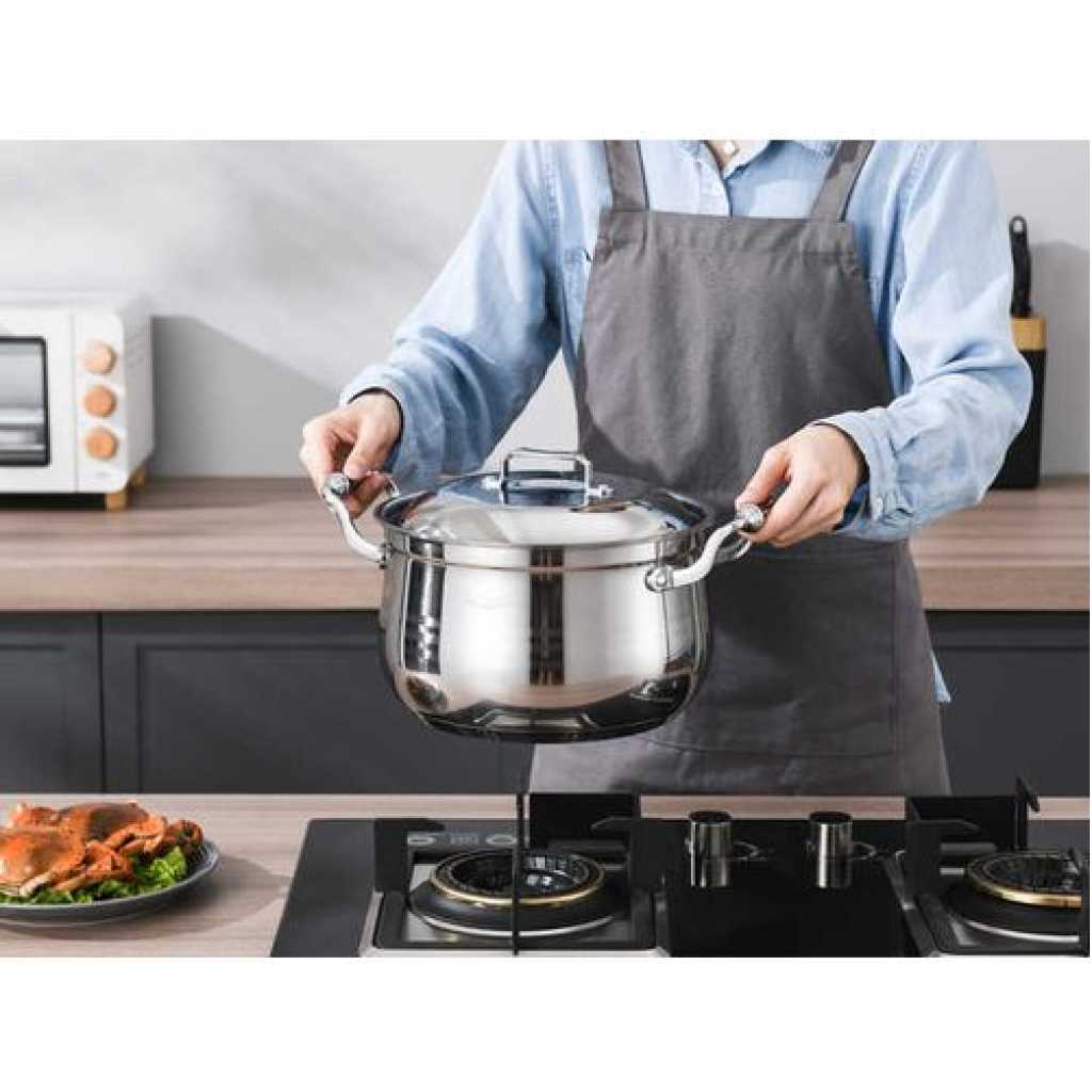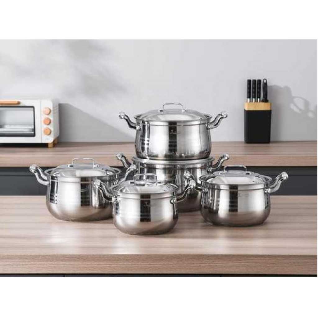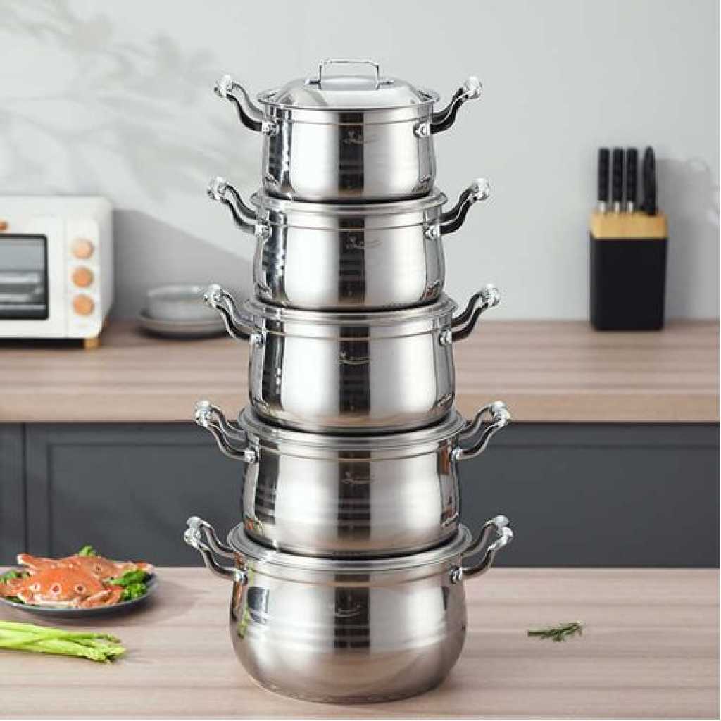 Key Features: 10 PC 22, 24, 26,28,30CM Stainless Steel Saucepans Cooking Pots- Silver. Color: Silver Material: stainless steel. Cover material: heat-resistant glass. Number of items in a set: 10 Bottom type: 5-layer. Measurement scale: yes. Handles fastening method: riveted connection. Handle type: hollow. Lid with a steam outlet: yes. Metal polishing: mirror/satin. Dishwasher safe: yes.