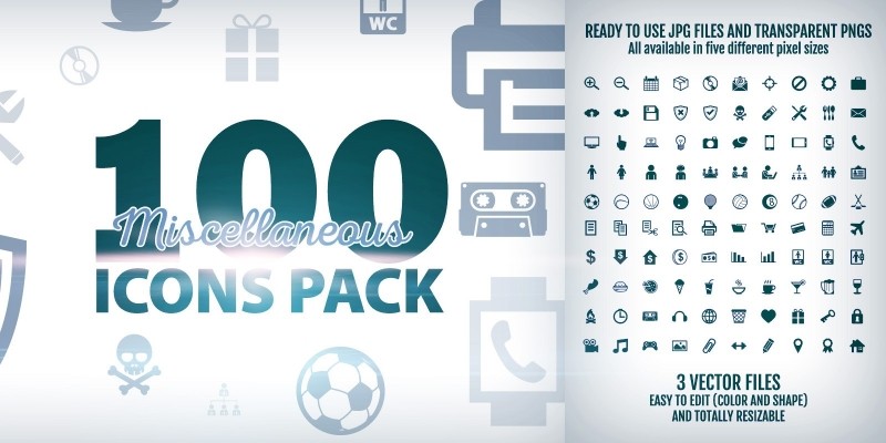 100 Miscellaneous Icons Pack. Miscellaneous icons pack contains 100 vector shaped icons. Ready-to-use JPG and transparent PNGs have also been included.