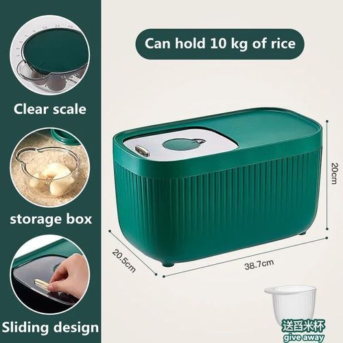 10kg Rice Bucket Insect-Proof & Moisture-proof This rice storage container has a 15kg capacity of rice (capacity may vary with the food density) Great for storing rice, cereal, flour, oatmeal, snacks, beans, sugar, pet food and more. Enjoy your meal with fresh food. This cereal container is made of high quality food grade ABS+PP. It’s also heat-resistant and dishwasher safe. Thick silicone seal keep foods fresh longer This food storage container can be placed on the table or In the cabinet, easy to use, clean and tidy.and flat design of the container makes some small items can be placed on the lid Especially designed to one new designed size Allowing You to organize your Kitchen neat and fresh like never before and frees up space in the pantry. Quality Guarantee. We have faith in our product and always back it up with trustful customer service, please reach out to us if you have any questions or problems about our products. Specification Material: ABS+PP+Metal Color: Green Capacity: 10kg Package Includes: 1 x Food Storage Container Key Features: Rice cover can be disassembled Flip cover design Large opening design, easy to spill out. Clear scale visible PP material, environmentally friendly material Thickened edges