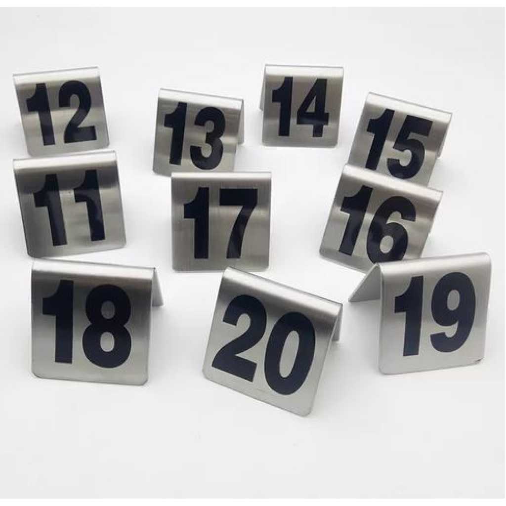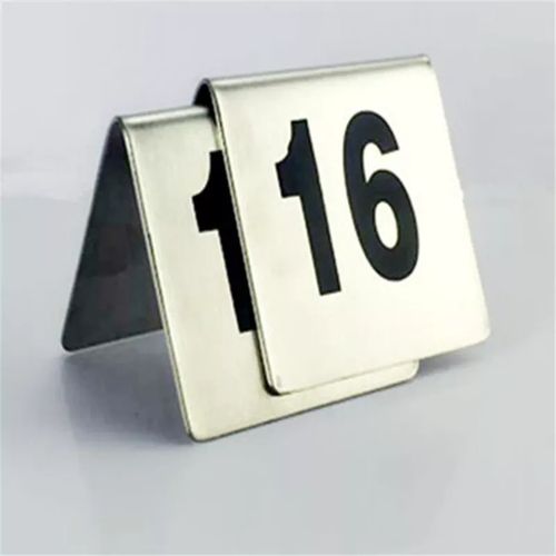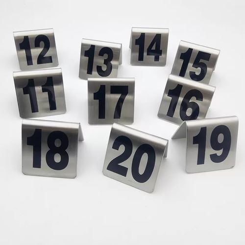 Stainless Steel Table Number Plate For Restaurant Hotel Bar Keep your tables easily identifiable with these Choice 11 to 20 stainless steel table tent signs. This set of table tent numbers is made of durable stainless steel with engraved numbers 1 through 50 on each side, making them visible from multiple angles. Ideal for catered events, restaurants, bars and pizzerias looking for a modern, more durable alternative to plastic table numbers, these table tent signs remove the guesswork for your employees and guests. Use this number set not only to identify tables but to identify orders, too! Simply give a number to each guest at the point of purchase, and let your staff come to them when the order’s up. Its design and convenient size make the sign easy to display without taking up too much space. Its small frame also makes it easy to store until it is needed again. Plus, since this set is made of stainless steel, it’s extremely easy to clean by simply wiping it down after use. Overall Dimensions: Width: 2 1/2″ Height: 2 1/2″ Key Features: Stainless Steel Table Number Plate For Restaurant Hotel Bar Give your table settings a classic look with our Black and Silver Table Number Make it easy for your guests to find their seats with this set that includes numbers 11 – 20 Labeled on each side with easy-to-read lettering Provides a professional look while removing guess-work for guests Design and size allow for easy display and storage Easy-to-clean stainless steel material Sturdy build resists bending and scratching and easily remains upright