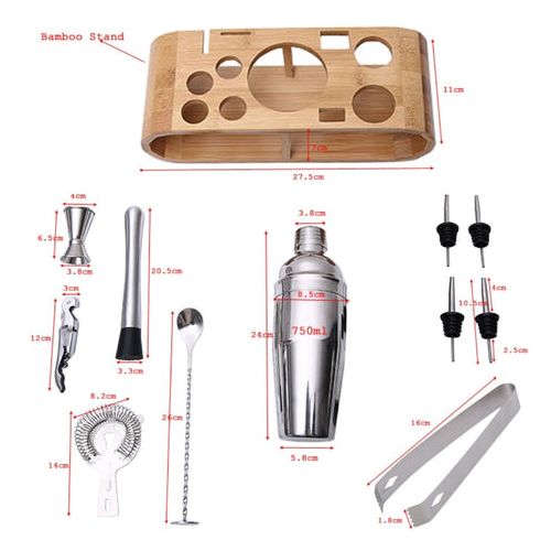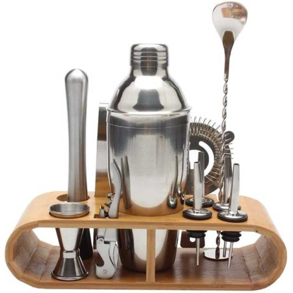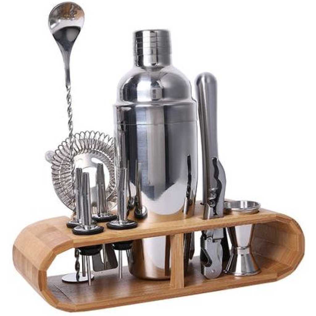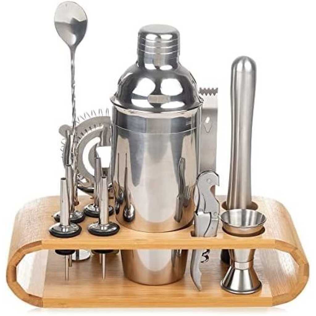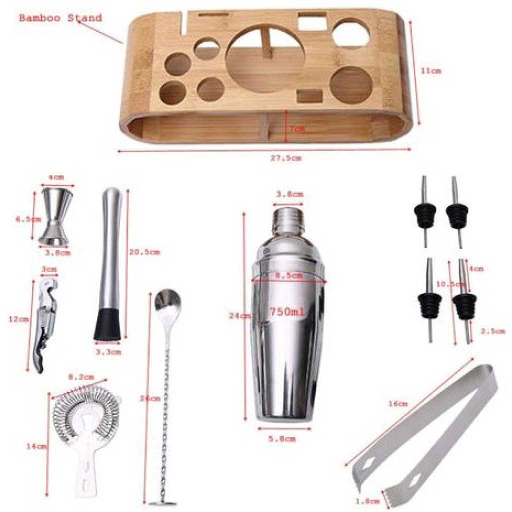 12-Piece Martini Cocktail Shaker 750ML In Stainless Steel And Bamboo Support Set- Silver. Everything You Need 12-Piece ALL-Inclusive bartender set of top-shelf cocktail tools . Will give you the power to whip up impressive cocktails for your guests. Whether you’re an amateur bartender or a professional cocktail mixing guru, whether you’re setting up a bar at home or at work, this bar set is a brilliant way to hit the ground running. Organization and Storage: Eco-friendly bamboo stand (Patented), carefully designed to keep your barware tools organized and accessible at all times. No more clutter in your kitchen drawers and cabinets. Show off your gorgeous cocktail kit with the unique bamboo storage rack. You will definitely win your guest’s attention. Solid And Durable: Heavy-duty and high-grade cocktail set. This entire bar accessories kit is made of stainless steel alloy: SS304 & SS430. Worry not, it’s all dishwasher compatible, so forget about wear and tear with these professional bar supplies Package contents: 750ml Shaker Muddler Strainer Ice Tongs Spoon & Fork 2 x Pourer 2 x Cork 15/30ml Jigger Drink Recipe Cocktail Stand Key Features: 12-Piece Martini Cocktail Shaker 750ML In Stainless Steel And Bamboo Support Set- Silver. Made from high-quality 304 food-grade stainless steel. 12 PCs in one set. Simple and easy to use. A lighter shaker makes it easier to mix wine. This cocktail set is ideal for making cocktails everywhere.