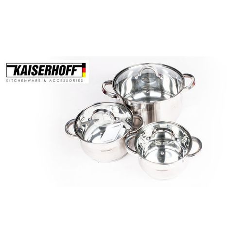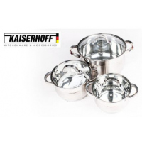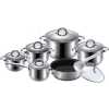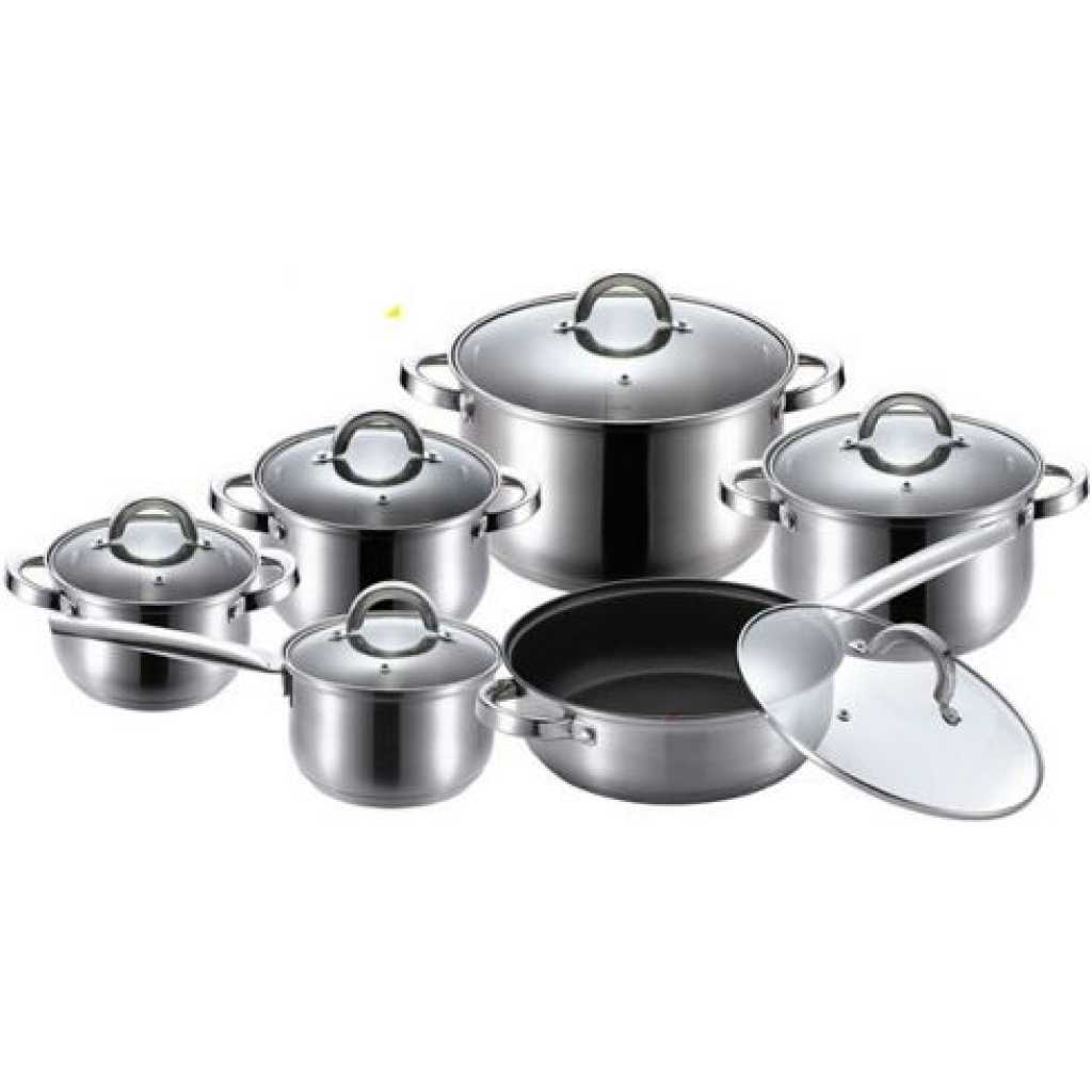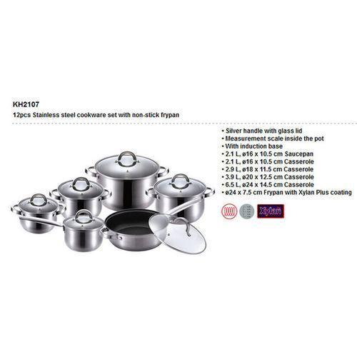 Key Features: Color : Silver Material: stainless steel. Cover material: heat resistant glass. Number of items in a set: 12 Bottom type: 5-layer. Measurement scale: yes. Handles fastening method: riveted connection. Handle type: hollow. Lid with a steam outlet: yes. Metal polishing: mirror / satin. Dishwasher safe: yes. K-gold plate knob and handle