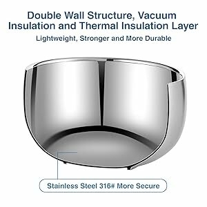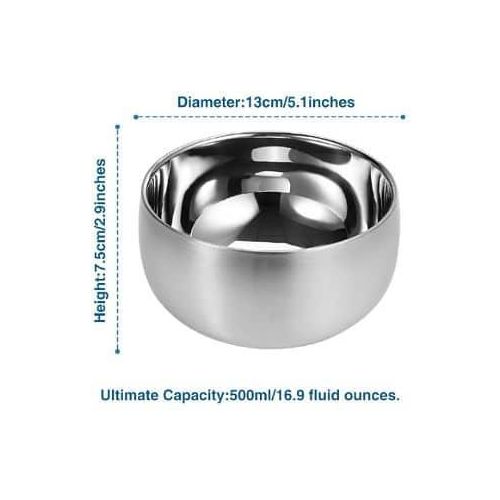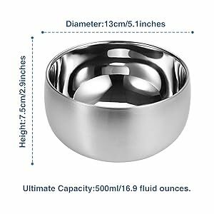 Key Features: (1)Material and surface technology: Stainless steel 316#,the inner side of the bowl is mirror polished,and the outer side is brushed. (2)Structural design: Double wall insulated design protects your hands from cold ice cream or hot soup! (3)Ultimate capacity:500ml/16.9 fluid ounces. (4)Bowl mouth diameter:13cm/5.1inches (5)Bowl height:7.5cm/2.9inches (6)Net weight of a single item:165g/0.36lb (7)Color:Silver (stainless steel primary color)