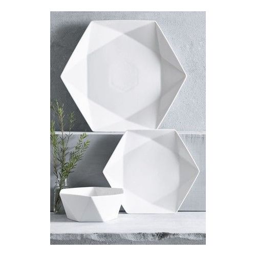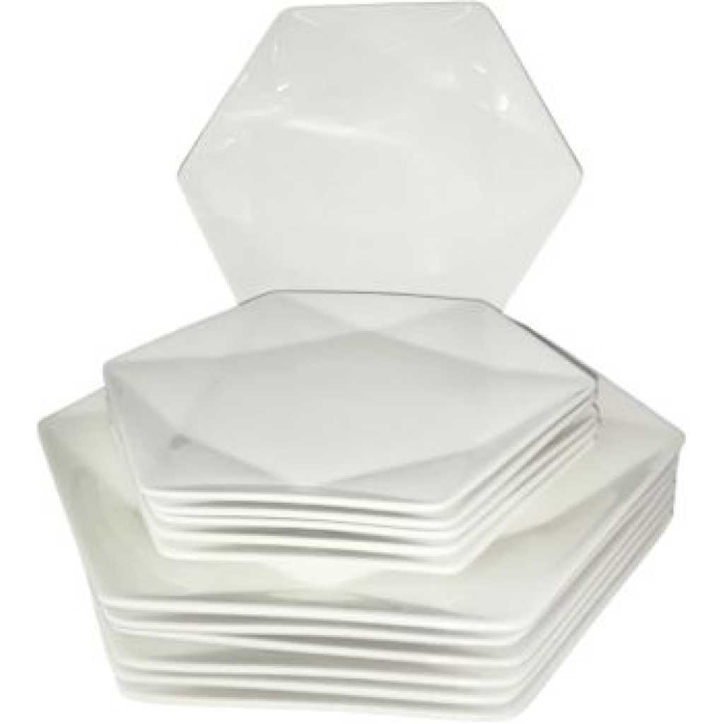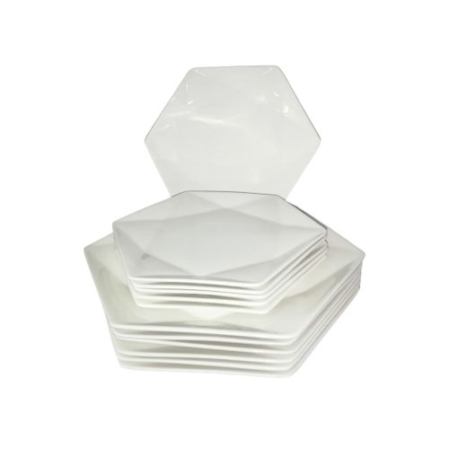 The Simple Lined 12 Piece hexagonal Dinner ware is part of the break and chip resistant clay dinnerware, allowing it to stand up to the rigours of everyday life and still look great. Contemporary pattern with sweeping self design lines against a white background. Slick squared shapes with square corners and flared rims fuse perfectly with the traditional square inside, resulting in a totally fresh but timeless look. Versatile enough for everyday and entertaining! Key Features: 12-piece set; service for 6 Six10.5″ (26.7 cm) dinner plates Six 8.5″ (21.6 cm) salad plates Porcelain square dinnerware is microwave oven safe to 450 degrees Dishwasher safe for easy cleanup 100 percent Porcelain