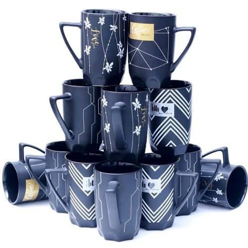 Set of 12pcs Black Ceramic mug, perfect for coffee, tea, hot cocoa and more.FDA approved lead and cadmium free,dishwasher and microwave safe Each cup 10 Oz, each size : 3.3″x4.5″x4.1″H(8.5×11.5×10.5CM) Traditional Elegant handle design,safe package is perfect for family and friends.High quality ceramic made,great for daily use. Made in China