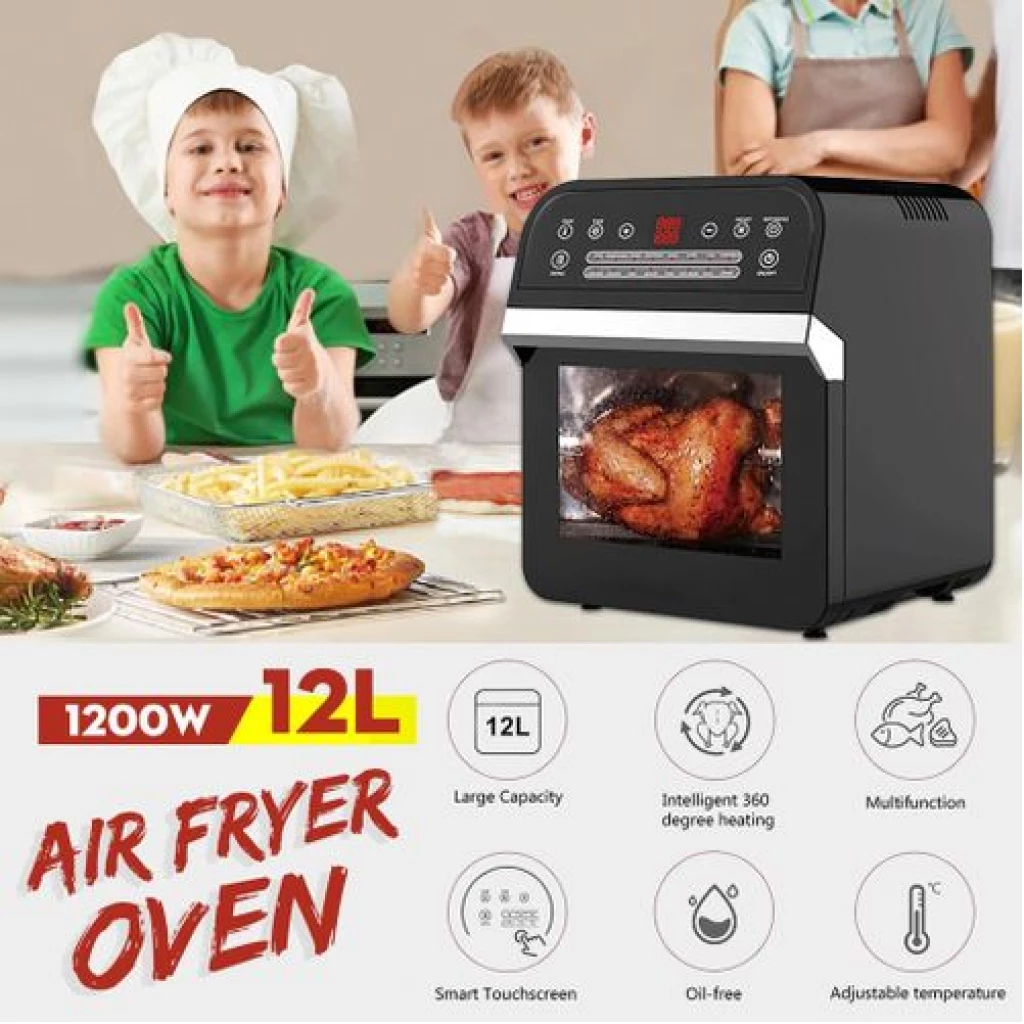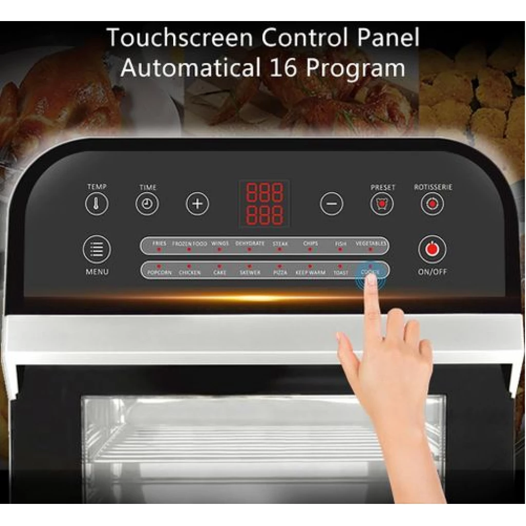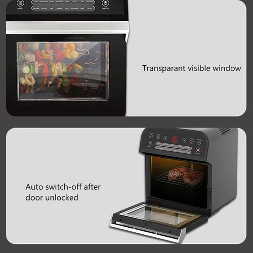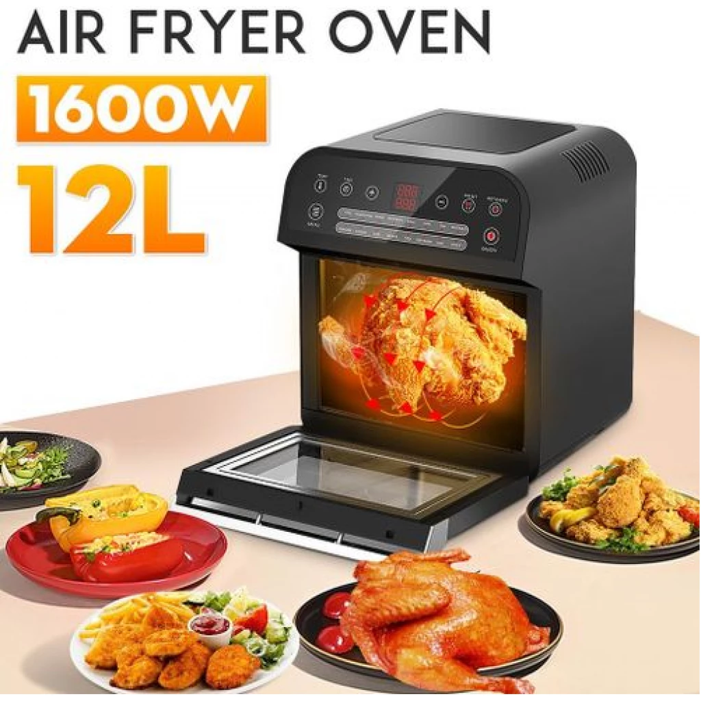 12L electric oven Airfryer grill 16 in 1 Machine: The powerful meal making machine is not only an air fryer, but also a rotisserie, dehydrator, pizza grill and oven toaster, it can complete various delicious food, such as roasted chicken wings, chips, pizza, steak and so on%3B A necessary tool in the kitchen, which can almost meet all requirements for people Family sized %26 Space Saver: 12L of cooking space makes this air fryer one of the largest on the market, while still being compact enough to fit easily on your countertop. 3 rack levels allow you to prepare family sized quantities, or control how fast and how crispy your food cooks Built in Rotisserie: prepare whole roasts, tendrloins, racks of Kababs, and even a whole chicken! Get crispy, tener meats, perfectly fish, and expertly roasted vegetables with the BioloMix air fryer oven’s built in rotisserie it’s fast, easy, and you’ll love it Includes Multiple Accessories: Comes with standard 5 accessories, everything you’ll need to make a homemade meal with ease Easy to use: Easy to read, simple to use control display with 16 presets takes the guesswork out of cooking times and temperatures. Cook for convenience or to impress without ever having to turn on the range. And when you’re done, The stainless steel interior and remove able, non stick drip pan makes for easy clean up Key Features: Digital Thermostat Temp. Setting 80℃-200℃ With 30 Mins Timer Auto Shut Off For Precise Cooking Rapid Air Circulation System Fry Food Faster And Save Energy 6 Cooking Presets Non-stick Coating Food Basket With LFGB With Over Heating Protection Function Cool-touch Housing And Handle Color: Black Dimension: 31.5×33.4x37cm / 12.4×13.1×14.6″ Power: 1600W Voltage: 220 240V Frequency: 50/60Hz Capacity: 12L