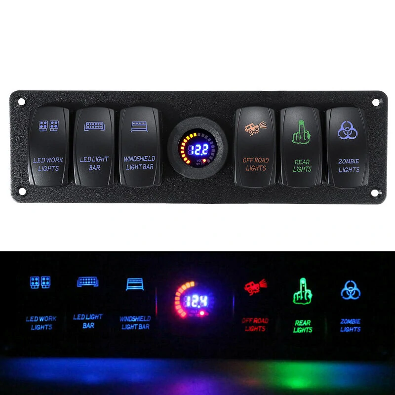 12V-24V 6 Gang LED Digital Voltmeter Marine Ignition Toggle Rocker Switch Panel