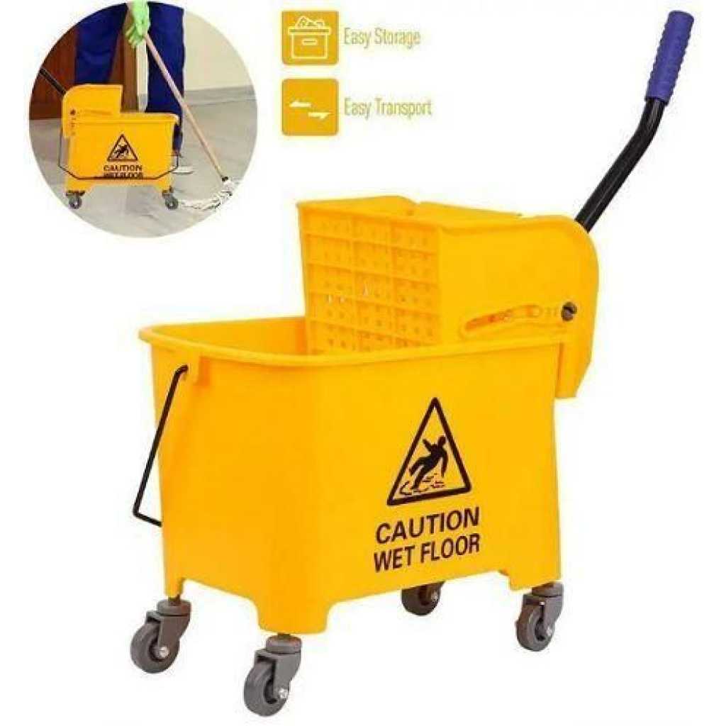 12L Mop Bucket Side Press Wringer Cleaning Commercial Mop Bucket On Wheels (Yellow, Plastic Wheel). 20L mop bucket and side-press wringer combo for cleaning floors or mopping up messes; designed for commercial use. High-efficiency side-press wringer works with fan mop holders; down-press wringer works with fan and jaw mop holders; wringers quickly send water back down into bucket. This is our commercial mop bucket, which features a small bucket with a high-efficiency side press mop wringer to speed up your mopping time. Mop bucket has a compact design and a side-press wringer to extract excess liquid from a mop and funnel the liquid back into the basin. The bucket and wringer are made of durable PP material and have four casters for mobility. It is perfect for various places like workplace, house and hotel. Use Tip: Put the mop in the bucket and rotate the mop to increase the thickness of the mop(which is better for water extrusion). The Press Wringer mop bucket squeezes the water out of the mop cotton yarn by physical extrusion, which is different from the washing machine’s working principle. The mop after squeezing water won’t dry too much, there just leaving the humidity which mopping floor needs. Specification: Material: PP Color: Yellow – Material: PP, iron, aluminium. – Size: 43.5×27.5x28cm. – Made of durable and hard structure plastic material. – Loop carry handle; integrated pour handle. – 4 smooth-rolling casters for quiet, convenient mobility. – Bright yellow color for easy visibility and added safety. – Mop not included. Made of durable and hard structure plastic material. Loop carry handle; integrated pour handle. 4 smooth-rolling casters for quiet, convenient mobility. Key Features: 12L Mop Bucket Side Press Wringer Cleaning Commercial Mop Bucket On Wheels (Yellow, Plastic Wheel). Wringer for Easy Water Draining: Equipped with a wringer, the bucket provides big convenience to drain the mop without hands soiling. Grid design makes the water drained even more thoroughly. And the splash guard will avoid water splashing to keep the floor clean. Energy Saving with 4 Universal Wheels: With four wheels made of superior TPR material equipped at the bottom, the commercial bucket brings big convenience to move especially full filled. And the universal design will make it easy to control and turn around. Ergonomic Rocker & Easy Control: The extended handle will reduce the discomfort of bending down. It is fitted with a blue rubber sleeve of comfortable grip, which increases friction and prevent hand slipping. The design will make the job down easier Large Capacity & Less Water Changing: The capacity of 34qt/8.5gal prevents frequent water changes, which makes it a perfect addition especially for onerous commercial use. The circulating filter system will also reduce water waste and protect environment. Less Broken with Superior Material: Made of thick and superior PP material, the household mop bucket has a sturdy construction and will serve you for a long time. The strong hardness and high temperature resistance make it not easy to break even if full filled of water.