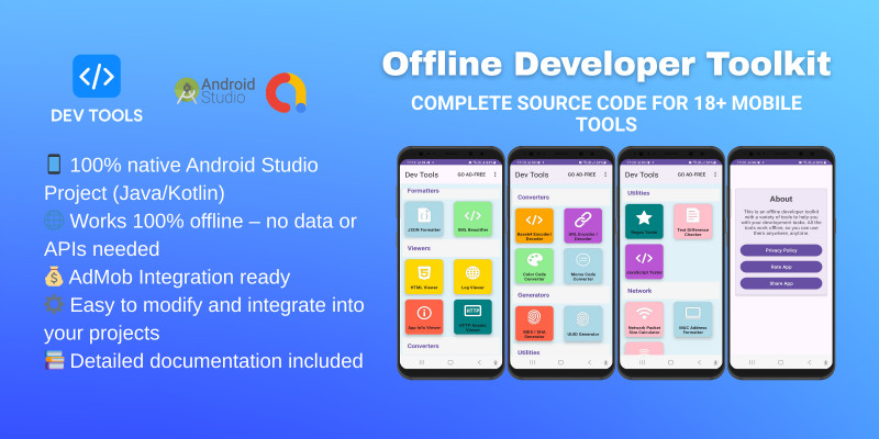 18 Dev Tools in One App – Full Source Code. Andriod Studio source code of a fully functional offline developer toolkit with 15+ essential tools for mobile development.