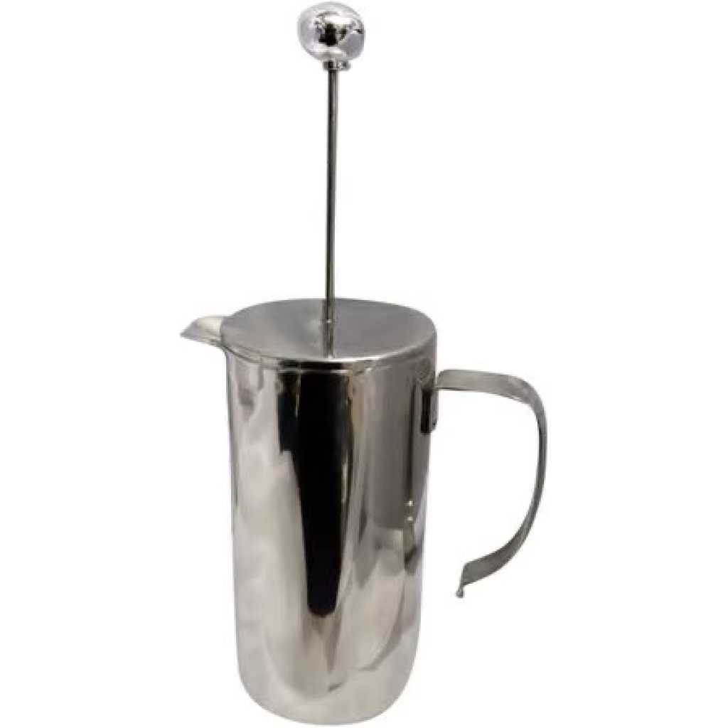 French Press Coffee Maker Why does coffee brewed from a French Press taste so amazingly different? Unlike other brew methods, the French Press gives you absolute control over the infusion time (longer infusion time produces a bolder and stronger cup). Perhaps more importantly, the unique screen filter of the French Press allows essential coffee oils to make their way into your cup; oils that would normally be blocked out and eliminated by paper filters. These oils are responsible for producing a very full body fantastically thicker and more flavorful than anything you’d experience from any other brew method, period. Better yet, the French Press is super inexpensive, simple to use, easy to clean, better for the environment (because no disposable filters are needed) and takes up virtually no space in your kitchen. Our 8-Cup French Press is similar to the SterlingPro French Press, designed with double walled Stainless Steel which retains brewing temperature better than glass versions and also won’t shatter when dropped. Add our French Press to your cart and treat yourself to some amazingly flavorful home brewed coffee! Key Features: The handle of the product is heat-resistant. V-shaped spout for easy pouring of the beverage. Durable construction. It also has stainless steel filter that does not allow rust to form. Easy to clean and dishwasher safe.