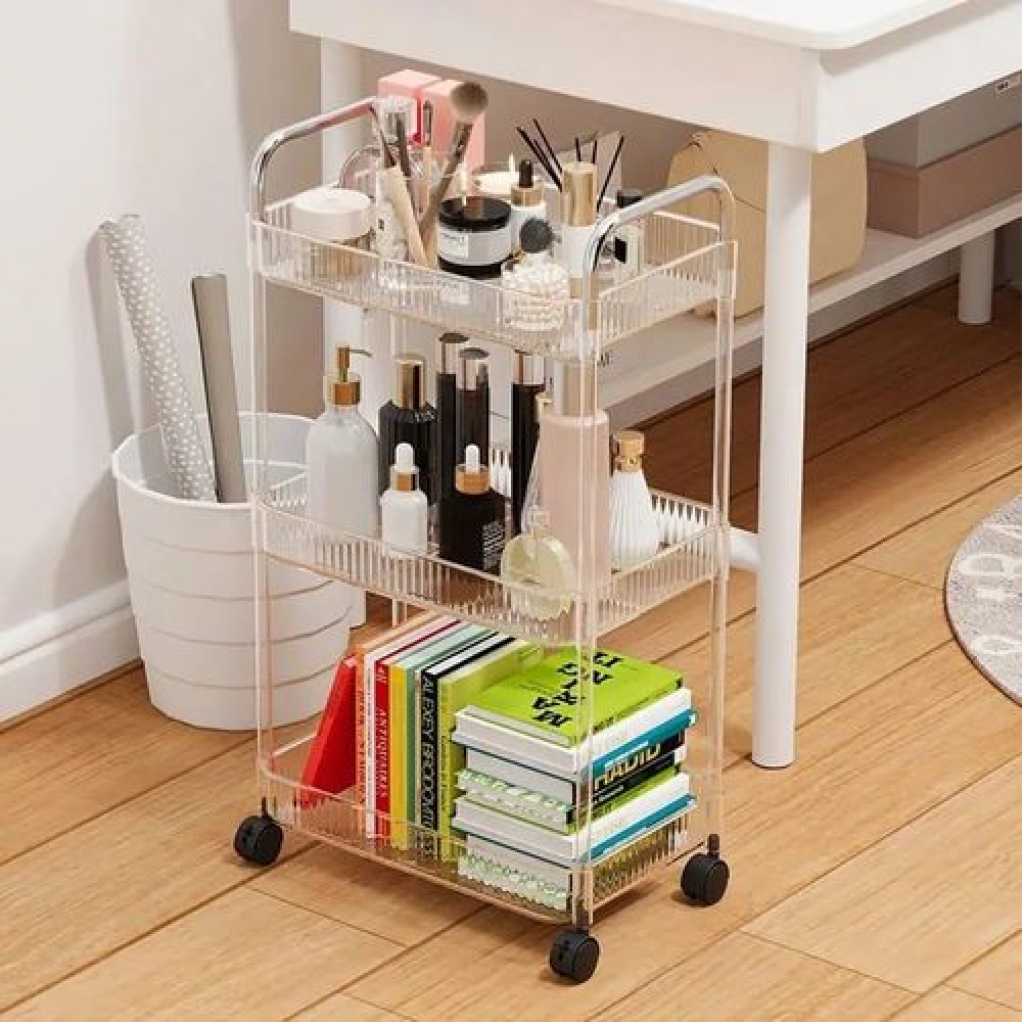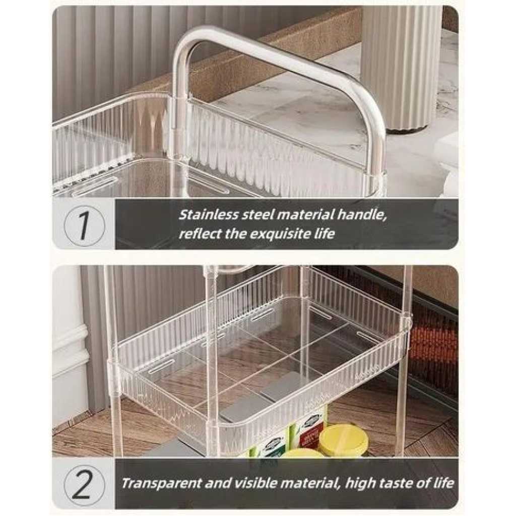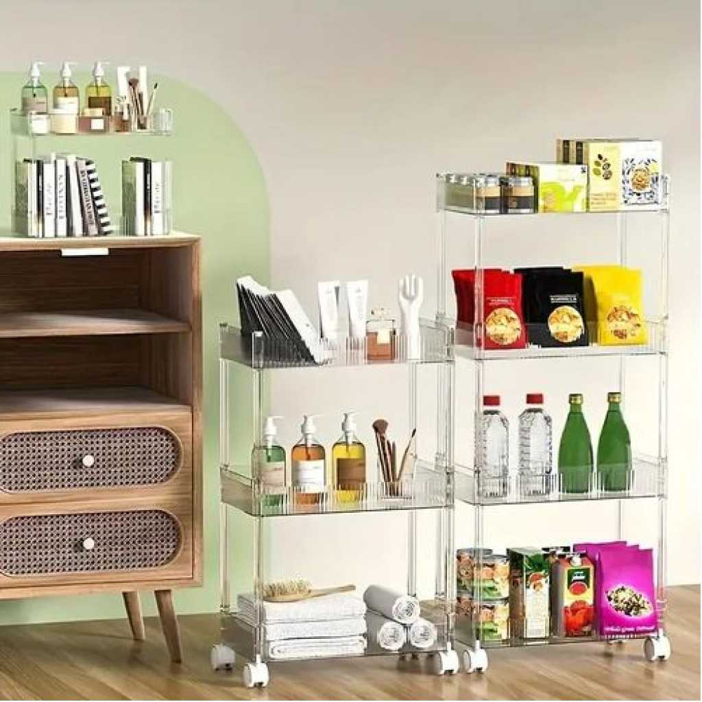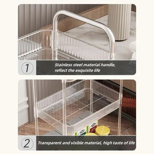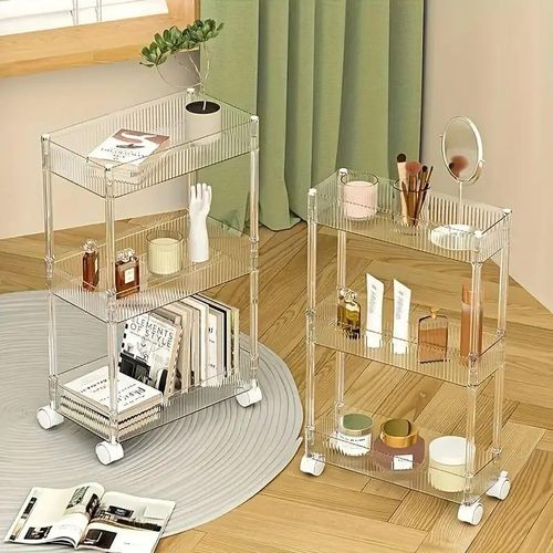 Key Features: 1pc Acrylic Clear 3 Tier Utility Cart, Rolling Cosmetics Laundry Organization Trolley Cart With Handle And Wheels, Multifunctional Storage Shelves Side Table For Kitchen Living Room Office Assembled Dimensions: 22”x 7.8”x 30”(H).inch Material: Made of durable and high transparency ACRYLIC, very sturdy, elegant, and easy to clean. Small Space Solution: Acrylic Narrow Rolling Beverage Shelves or Trolley All-purpose used acrylic storage shelf. Best Choice for your Bathroom, Kitchen, Dining room, Bar, and Living room for Storage purposes. Neatly displayed and easy to locate. Easy to Assemble and Light Weight for Effortless Portability.