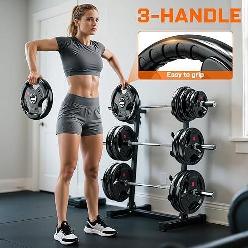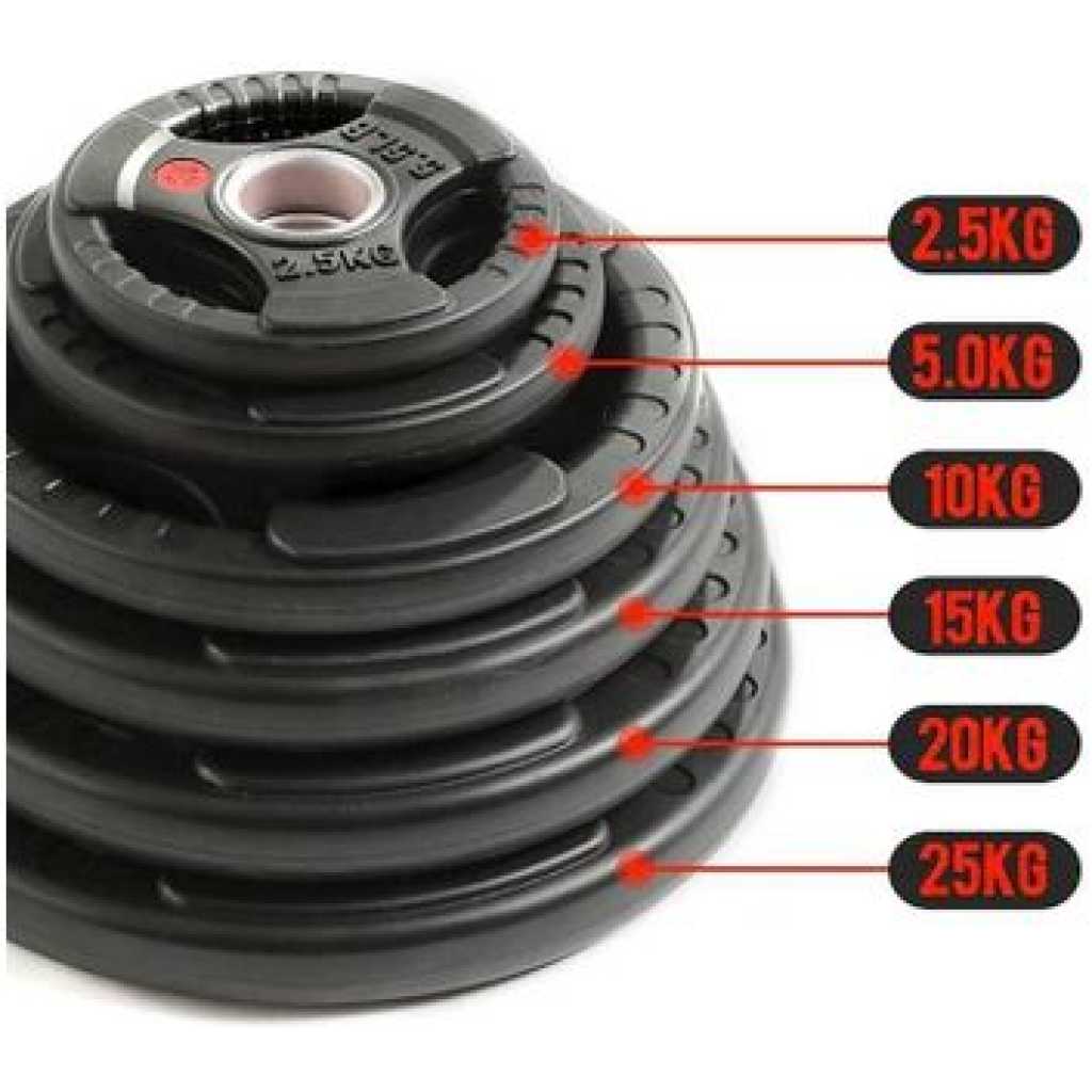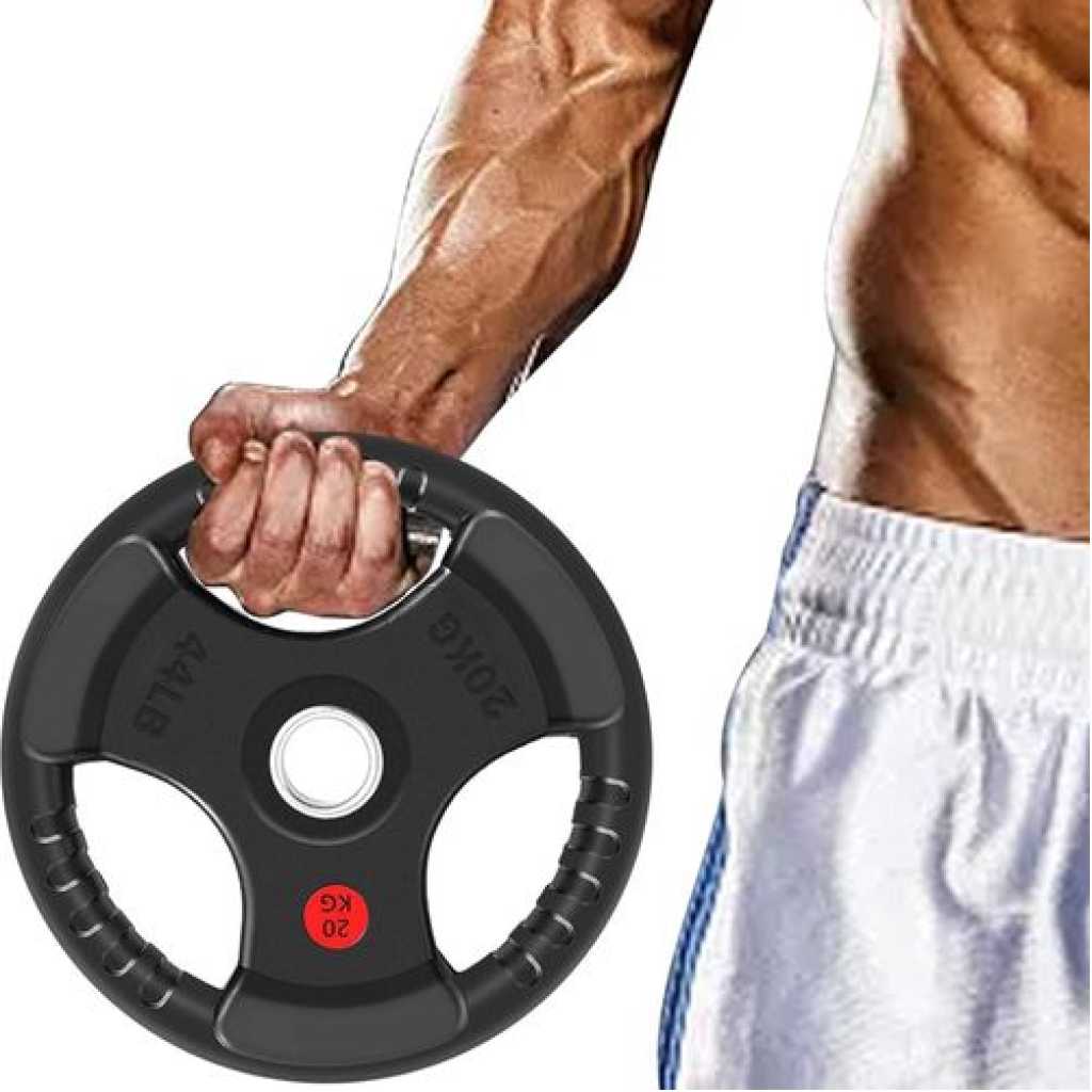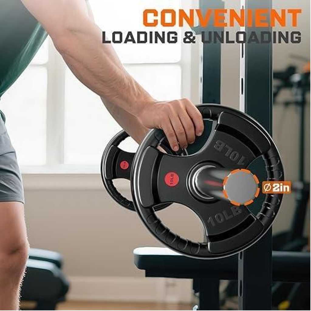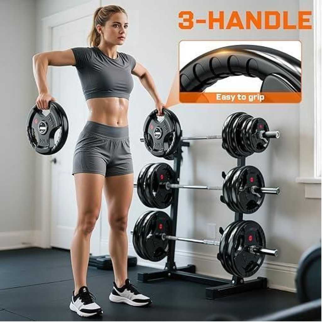 Key Features: A pair of 35LB plates. Additional weight options available: 2.5LB, 5LB, 10LB, 25LB, 35LB, and 45LB. Crafted from solid cast iron with a 2-inch center hole, these plates are designed to fit Olympic bars with a 2″ diameter and can also be used with 2″ dumbbell bars. Each plate is coated with a durable black virgin rubber finish, providing protection against rust and corrosion while ensuring low bounce and an odor-free experience. Featuring three large openings with textured strips, these plates offer a secure grip and are clearly labeled in both pounds (lb) and kilograms (kg) for easy identification. Perfect for muscle-strengthening exercises, endurance training, and improving flexibility and balance.