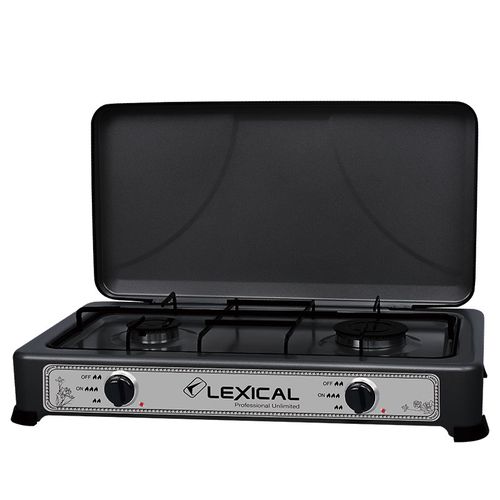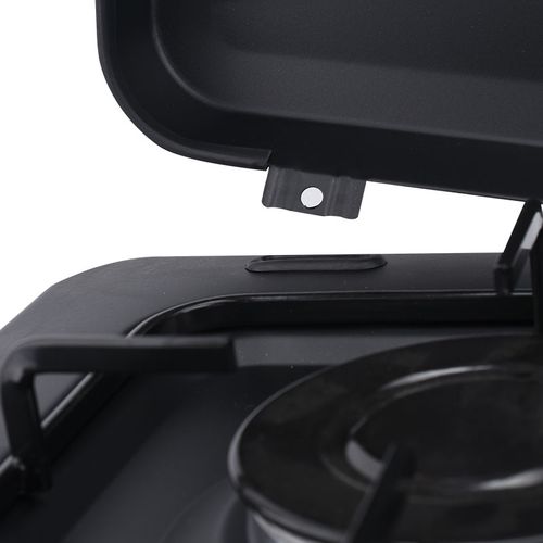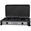 2 Burner Gas Cooker Stove With Lid -Black. Our portable gas stove is a great choice for your outdoor kitchen, when you are going camping or even when you just want to cook something easily and quickly. The temperature can be adjusted at the push of a button.This device is equipped with a stainless steel burner, and a removable grill and lid. Ideal for camping, temporary arrangements, camper and outdoor cooking.This hob connects easily to a bottle of butane or propane gas. Good performance with fully adjustable burners. Removable enamel pan supports for easy cleaning. Cover shields burners from wind for maximum heat.