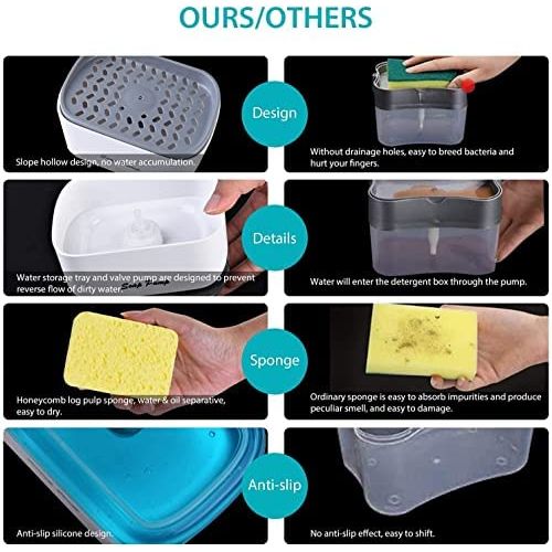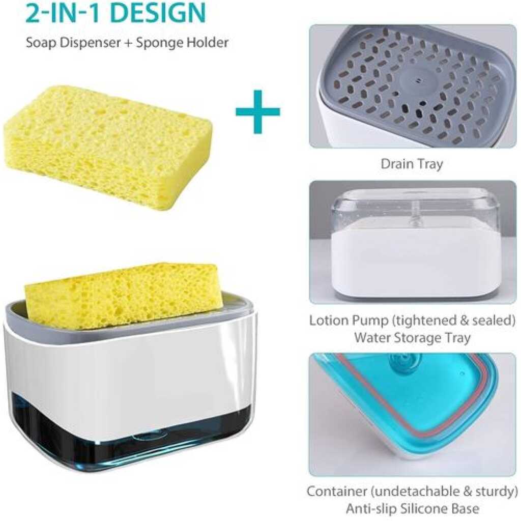 2-in-1 Countertop Dish Washing Liquid Soap Dispenser Pump With Sponge Holder Hand Sink Caddy Organiser Tidy. Cleaning dishes is about to get a whole lot faster with this Soap Pump & Sponge Caddy. Fill it up with 13oz of your favorite dish soap, then use the included sponge to press down on the pump, which dispenses the perfect amount of dish soap up onto the sponge. When you need more, just pump again for another shot of soap. No more stopping to grab the soap bottle. Any other sponge or scrubber will work with it too! INNOVATIVE DESIGN, HIGH QUALITY, LONG LASTING & RUSTPROOF Finally! Unlike other traditional dispensers, this 2-in-1dishwasher soap dispenser is designed to be superior, made of unbreakable ABS plastic making it long-lasting. INSTANT 2-IN1 DISPENSER + Caddy, 1 HAND OPERATION, COMPACT ORGANIZATION: Sink dispenser with attached caddy holds sponges, scrubbers, rags, and scouring pads in one convenient place while keeping water off of kitchen counters. PRECISE, EFFORTLESS DISPENSING & LARGE CAPACITY: Dispense the perfect amount of soap onto the sponge, extremely easy to use. The container has a large capacity of 13 ounces so you don’t need to refill it frequently. Works with all kinds of liquid soaps. VERSATILE USE – Best for home, school, office, hospital, hotel, restaurant, factories, airport, gas station, and so on. Ideal for commercial and public Places. SAVE MONEY, SPACE, and TIME! This dishwashing dispenser will totally transform your kitchen life, designed to wash dishes FASTER, the instant operation will save you time and 1 hand operation will keep your ENERGY level always high. Choosing the Soap Dispenser Makes your kitchen Tidy! With this dish soap dispenser and sponge holder, the cleaning of dishes will not be cumbersome. Fill it with 8.5 ounces of your favorite dish soap, and then use the attached sponge to press the pump to dispense the perfect amount of dish soap on the sponge. When you need more, just pump out some more soap again. No longer need to stop to get a soap bottle. Any other sponge or scrubber can also work with it! Specifications: Material: ABS Size: about 5.1X3.35X3.5 Inches