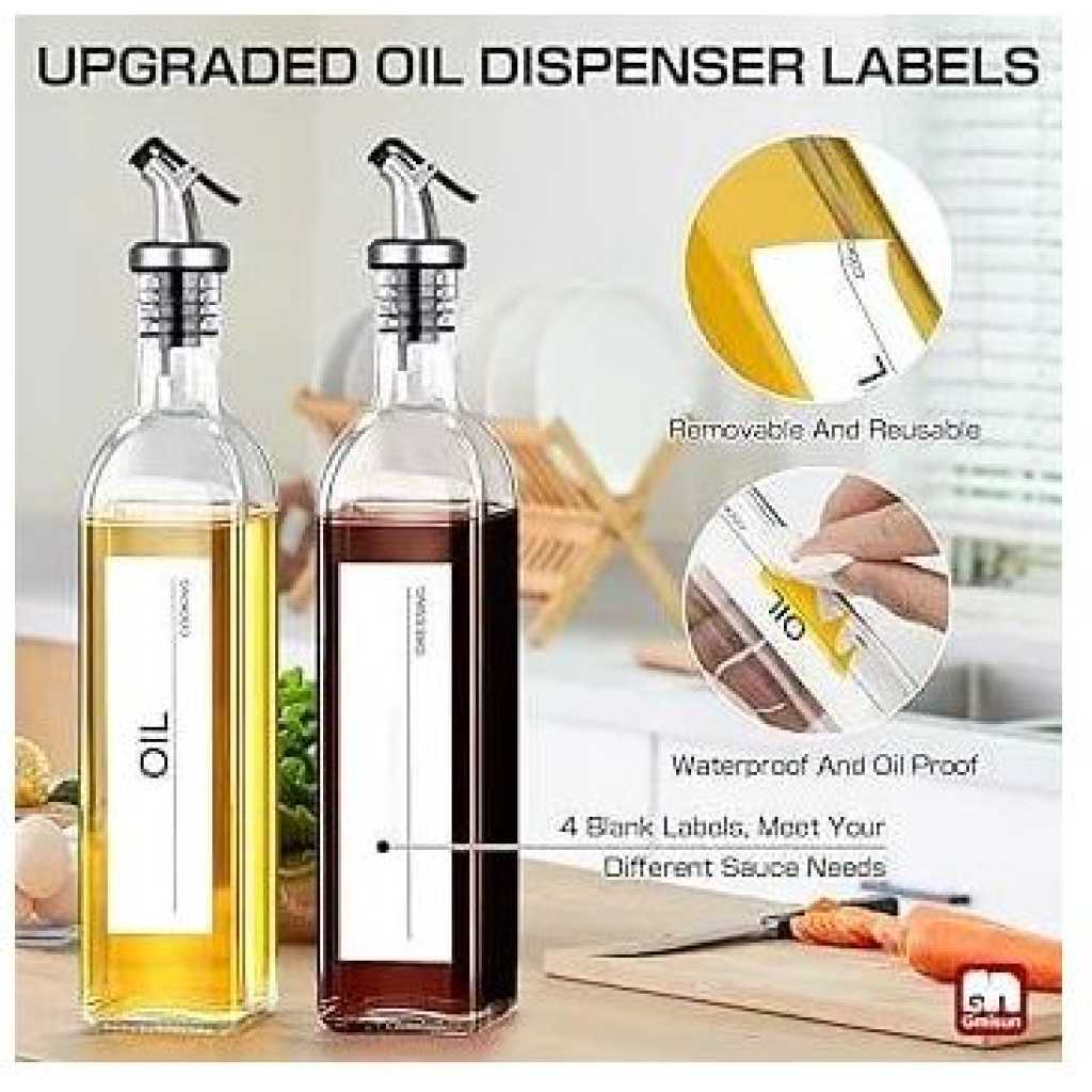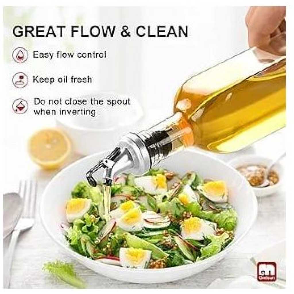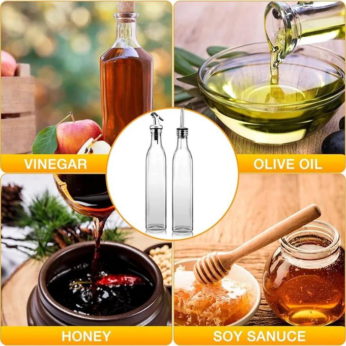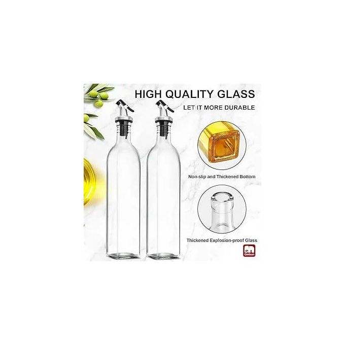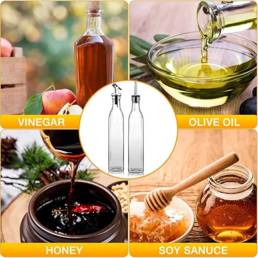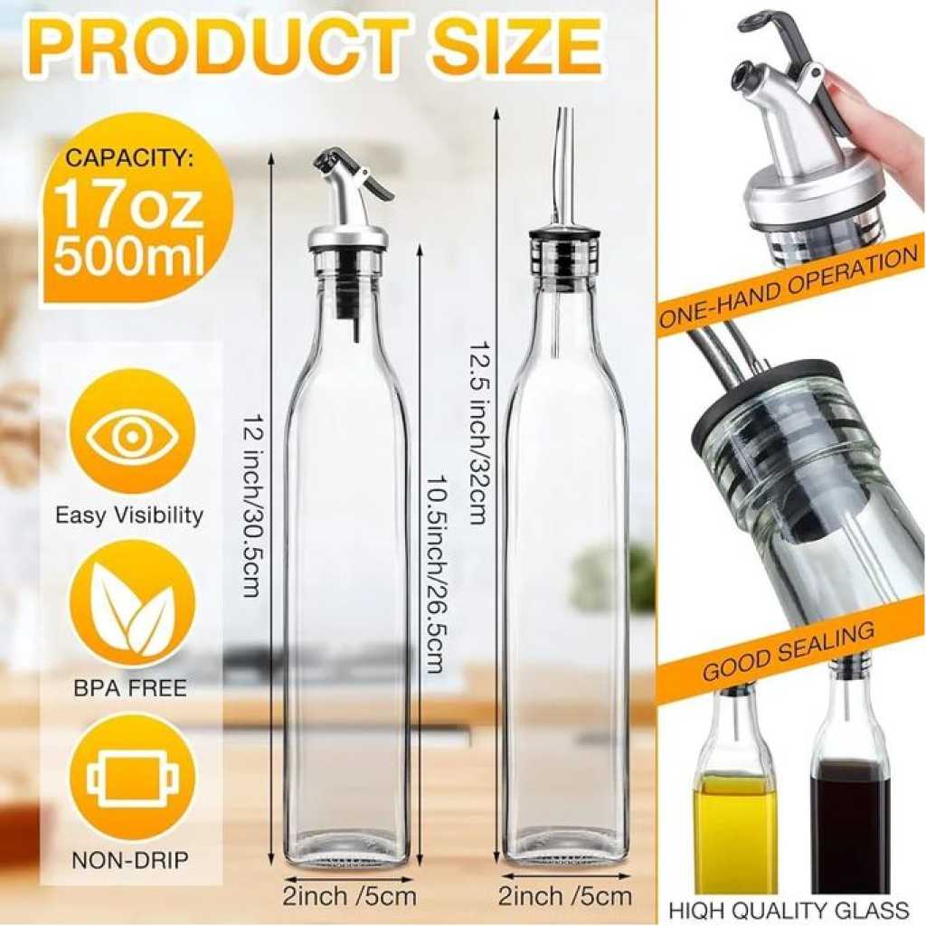 Key Features: 2 Pieces Of Glass Oil Dispenser Bottle 500 ml for Kitchen, Vinegar Olive Oil Dispenser Oil Bottle for Cooking, Clear Glass Oil Storage Bottle Transparent Pourers Oil dust proof, leak proof pourer, Wine dispenser Pours liquor, wine, vinegar, syrup, juice and oils. Oil bottle is Suitable for storing liquid condiments such as most of olive oil, vinegar bottle, red wine ,Pours liquor, syrup, juice and oils. classical bottle Most classical bottle are available, most of olive oil, vinegar bottle, red wine classical bottle. Thoughtful Design No drip pouring. Classic and elegant restaurant look and feel. Nonporous style means nothing gets in.