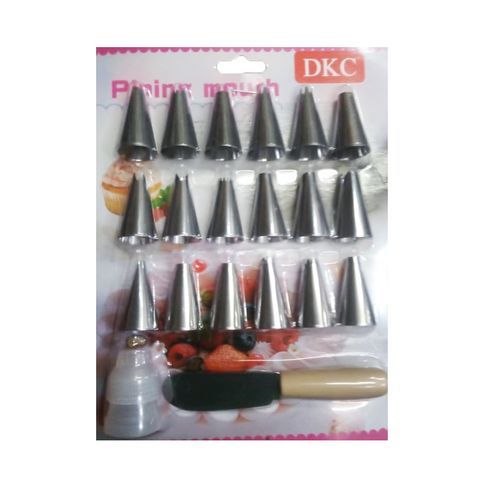 20 Pieces Set Useful Cake Icing Decorating Tool Kit-Silver This icing decorating tool kit has 18 piping nozzle pieces in a set and a spatula plus a screw. They are absolutely multi-purpose and very useful in decorating cake toppings and cupcakes. We highly recommend them to the best bakers out there. With this set, you will be able to make different cake designs as per each chosen piping nozzle. Key Features: 20 Pieces Set Useful Cake Icing Decorating Tool Kit-Silver Affordable Very easy to useful It has a plastic screw for good fastening Comes with stainless steel piping nozzles The piping bag is very handy It decorates cakes awesomely You can decorate cakes in different designs