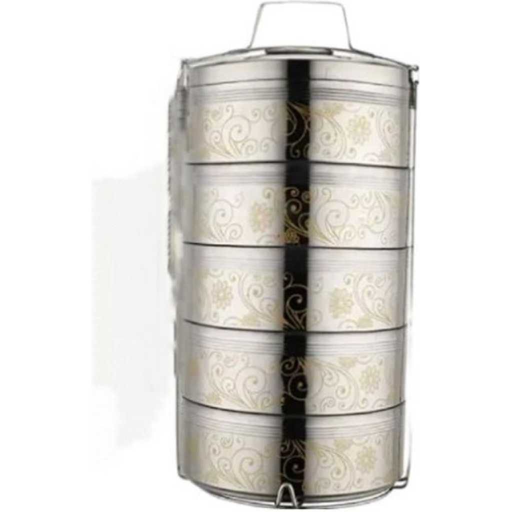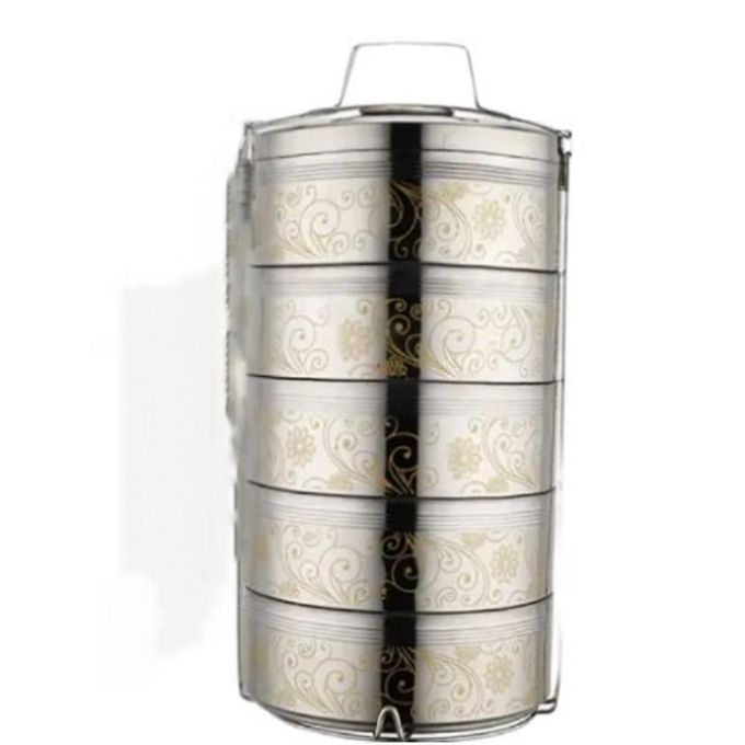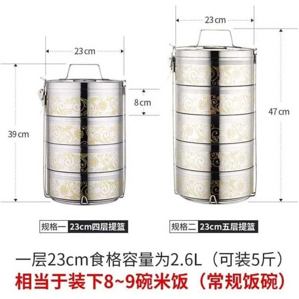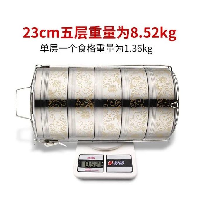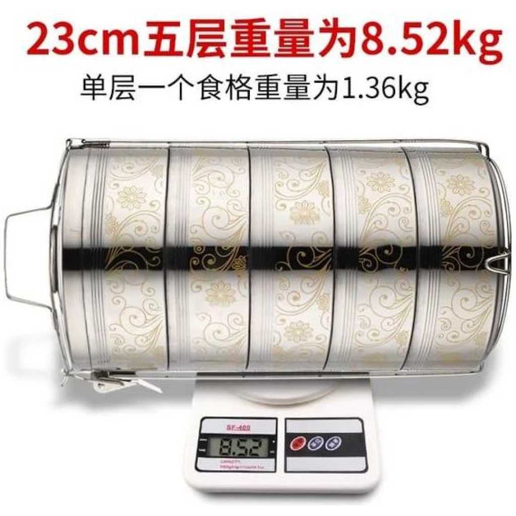 23CM Stainless Steel Air Tight 5 Layers Food Container Carrier Lunch Box Tiffin -Silver 【material】made by 304 stainless steel,with food grade PP cover,BPA free.Stainless steel is thick and strong plastic casing 【useful】You can put different food into it, such as Noodles,salad,fruit, sandwich,eggs,rice an so on.If you want keep food warm,the tray is removable design,you can pour hot water into the bottom Of the box,close the cover,please look at the picture.You will love how the compartments are separated and seals nicely 【capacity】Large capacity, large size, big enough for adult's food. 【Carry】The lunch box set with insulation bag and spoon set,easy to carry around.The insulation bag also can keep your food fresh.when you go to work,you can carry it at your car or the bus. 【The right size】Perfect size to go inside a lunch bag too