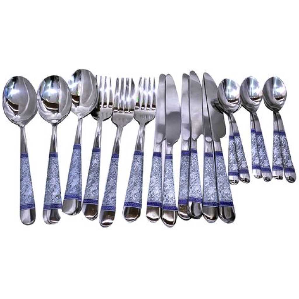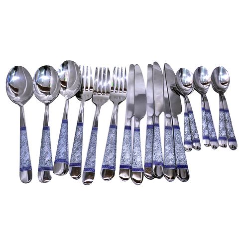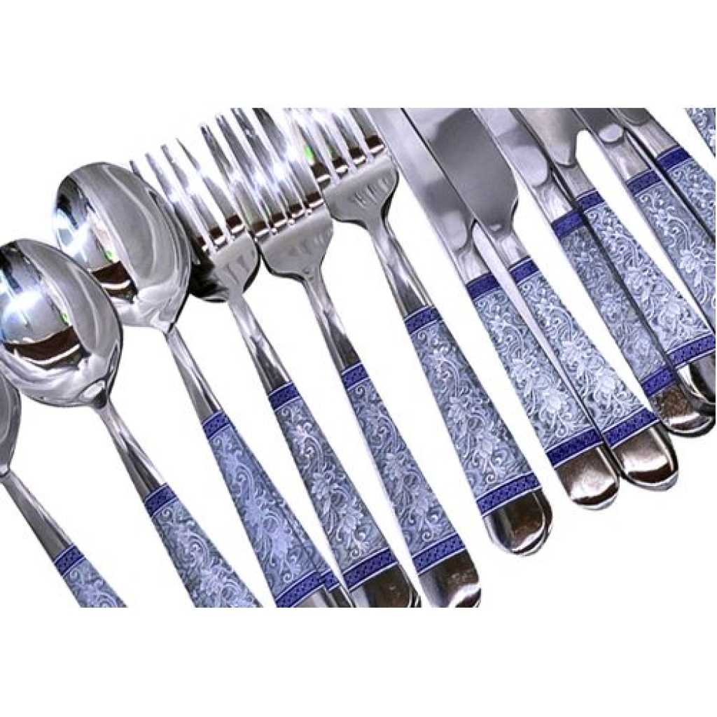 24 Piece Blue Flower Dinner Cutlery (Forks, Spoons & Knives) – Silver. A set of stainless steel cutlery suitable for a fine dining experience. Full set includes 6 forks, 6 tea spoons, 6 table spoons, 6 table knives. Key Features: 24 Piece Blue Flower Dinner Cutlery (Forks, Spoons & Knives) – Silver. 6 forks 6 teaspoons 6 tablespoons 6 table knives High quality