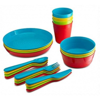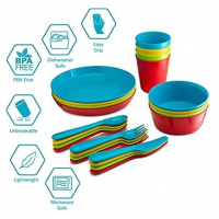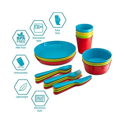 Serve your kid’s food in this colorful plastic tableware set and be sure that they will be more than excited to eat their healthy food! This premium plastic flat ware set includes 24 items in 4 beautiful colors (green, blue, red, and yellow):4 plastic bowls 4 plastic cups 4 plastic forks 4 plastic knives 4 plastic spoonsSpecially made for children, these plates, cups and cutlery are unbreakable, very lightweight, and they have super-smooth edges. It’s Not THAT Kind Of Plastic!Don’t worry, this plastic flatware set is made with reusable, microwavable and dishwasher safe plastic, so it can be used over and over again! When your plastic bowls, plates and cups are clean, you can easily store them in your kitchen cabinets, thanks to their stackable design.In other words, this colorful plastic tableware set is reusable, durable, practical, and an eco-friendly choice! Your Kid’s Safety Is Our Top Priority!For this reason, we have made sure that the plastic material of the kid’s cups and cutlery is BPA free and 100% nontoxic!In other word, this plastic dinner ware set is an absolutely safe choice for kids, toddler and even for babies! Key Features: 24-piece set The plastic dinnerware is microwave safe Dishwasher safe for easy cleanup 100 percent Plastic Multi colored.