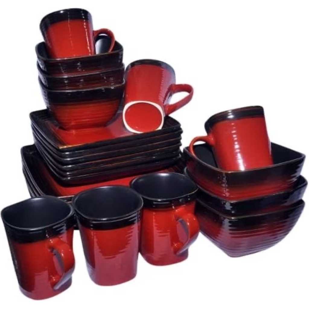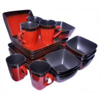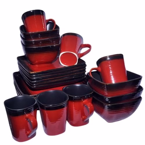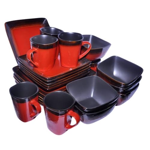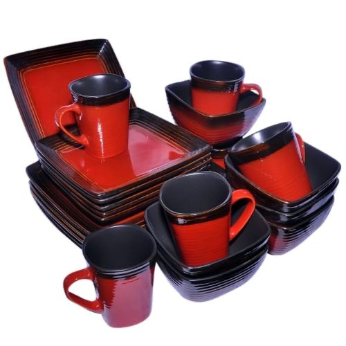 The Simple Red 24 Piece Square Dinner Set is part of the break and chip resistant clay dinnerware, allowing it to stand up to the rigours of everyday life and still look great. Contemporary pattern with sweeping self design lines against a white background. Slick squared shapes with square corners and flared rims fuse perfectly with the traditional square inside, resulting in a totally fresh but timeless look. Versatile enough for everyday and entertaining! Key Features: 24-piece set; service for 6 Six10.5″ (26.7 cm) dinner plates Six 8.5″ (21.6 cm) salad plates Six 6.25″ (15.9 cm) bowls Six 12 oz mugs The Porcelain square dinnerware is microwave and oven safe to 450 degrees Dishwasher safe for easy cleanup 100 percent Porcelain