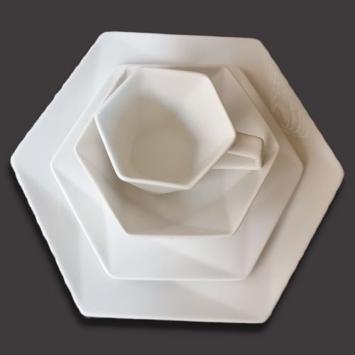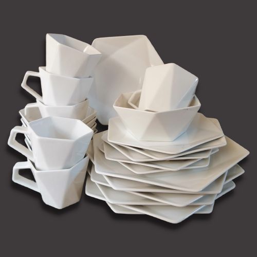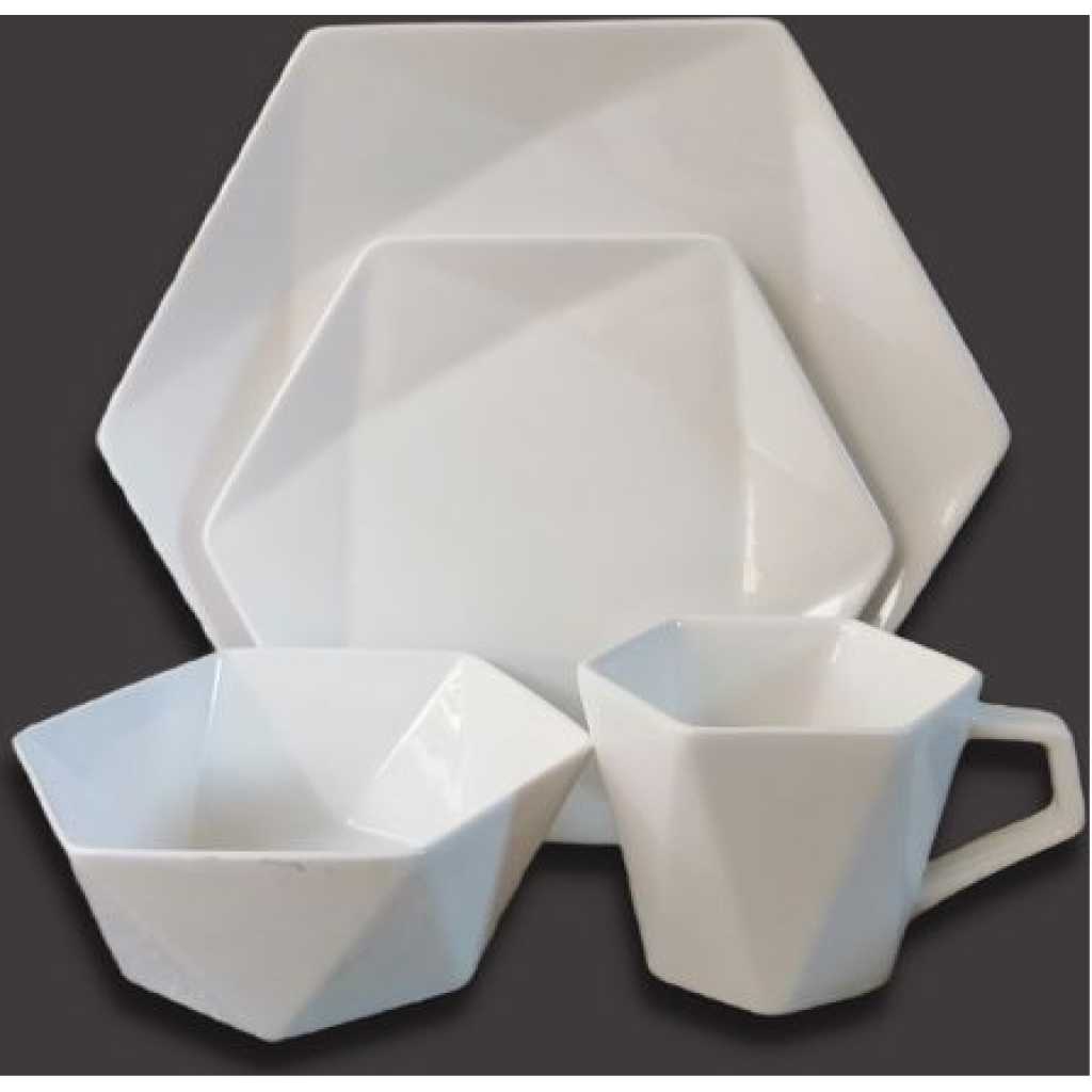 The Simple Lined 24 Piece hexagonal Dinner Set is part of the break and chip resistant clay dinnerware, allowing it to stand up to the rigours of everyday life and still look great. Contemporary pattern with sweeping self design lines against a white background. Slick squared shapes with square corners and flared rims fuse perfectly with the traditional square inside, resulting in a totally fresh but timeless look. Versatile enough for everyday and entertaining! Key Features: 24-piece set; service for 6 Six10.5″ (26.7 cm) dinner plates Six 8.5″ (21.6 cm) salad plates Six 6.25″ (15.9 cm) bowls Six 12 oz mugs Porcelain square dinnerware is microwave oven safe to 450 degrees Dishwasher safe for easy cleanup 100 percent Porcelain