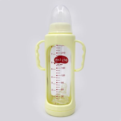 The bottle body is made of polypropylene (PP), a highly transparent and environmentally-friendly material. It is safe and non-toxic, and does not contain the chemical substance bisphenol A (BPA) that interferes with hormone secretion. High toughness, strong impact resistance, not easy to break, and can resist a variety of organic solvents and acid-base corrosion. Automatic straw design, break the traditional milk bottle to get high suction method, any position can suck freely. With the handle, it is more convenient to use. Nipples are made of food-grade silica gel with a special process, moderate softness and hardness, and a comfortable touch. Air valve design, the pressure inside and outside the bottle can automatically maintain balance, pacifier is not easy to absorb flat, so that baby sucking smooth, while avoiding inhalation of excessive air caused by vomiting or breast milk. The cross-hole design has the effect of automatically adjusting the milk volume without sucking or leaking and with the sucking force of the baby. All parts can withstand high temperatures up to 120 degrees and can be boiled in the water for disinfection. Wash the parts before use and put them into water and sterilize them for 5 minutes. When boiled and sterilized, the amount of water should be sufficient to prevent the product from deforming due to prolonged exposure to the bottom of the pan or the edge of the pot. After preparing the milk, insert the nipple into the thread and gently pull it out. Key Features: product Type: Feeder Material: Plastic Good Quality Product BPA free feeder Capacity: 240 ml Materials: Glass With Handle Easy to Wash Age: 6 months- 1.5 years Have cover with a plastic