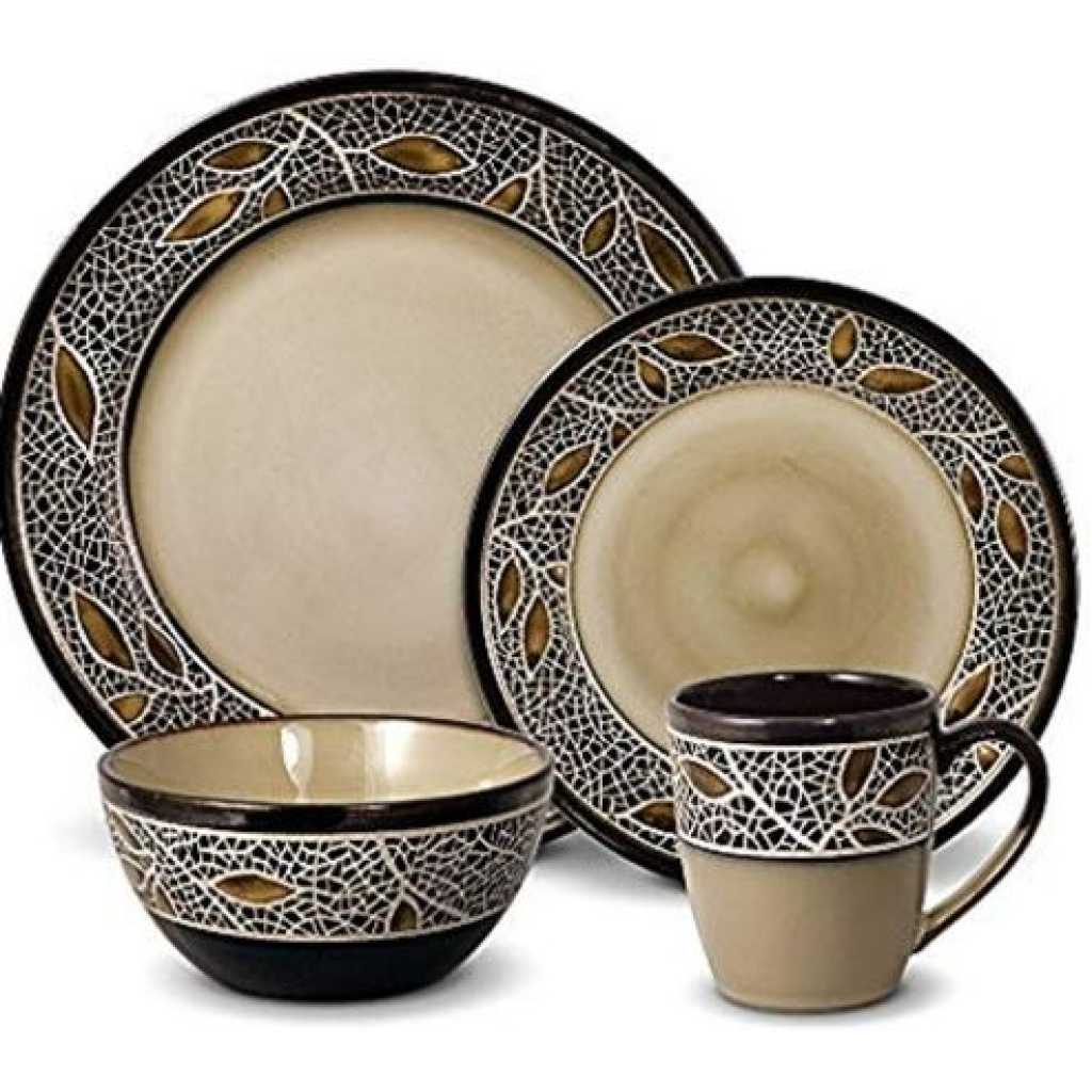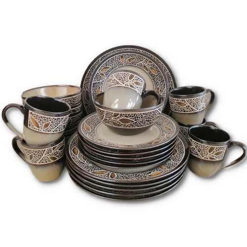The Simple Lined 24Piece round Dinner Set is part of the break and chip resistant clay dinnerware, allowing it to stand up to the rigours of everyday life and still look great. Contemporary plain cream inside with shinny black background outside . Sleek round shapes and flared rims fuse perfectly with the traditional rounded inside, resulting in a totally fresh but timeless look. Versatile enough for everyday and entertaining! Key Features: 24-piece set; service for 8 Four 10.5″ (26.7 cm) dinner plates Four 8.5″ (21.6 cm) salad plates Four 6.25″ (15.9 cm) bowls Four 12 oz mugs The Porcelain square dinnerware is microwave and oven safe to 450 degrees Dishwasher safe for easy cleanup 100 percent Porcelain