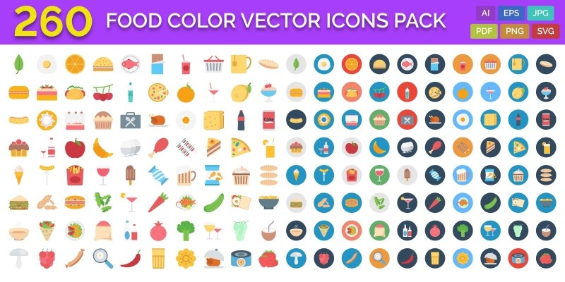 260 Food Color Vector Icons Pack. 260 Food Color Vector Icons