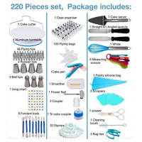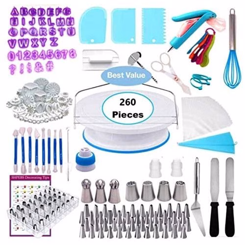 PROFESSIONAL CAKE DECORATING SUPPLIES KIT Colors make us free and beautiful. With 260 pcs cake decorating tools you will have the best possible to create your own design. Feel free with your creativity. We believe our baking kit could bring happiness to your life. Unlike the average cake tools made of flimsy plastic and thin metal, the Cake Decorating Kit is made of rust-proof stainless steel and sturdy, BPA-free silicone, Dishwasher safe! Our decorating nozzles are the colorfully on the market, and Piping Tips are numbered to match our Decorating Piping Chart 1 non-slip turntable 48 small decorative mouths 1 layerer double thread cutting 1 6 inch plastic straight spatula 33 sets of 33 fondant tools 1 6 inch plastic straight spatula 8-piece plastic carving pen blue 4 Russian decorating mouthpieces 1 umbrella brush 3 spherical decorating mouths One 48-head small plastic box 1 rust-free steel round cake spatula 1 manual 2 small converters 1 sandbag 1 three-hole blue Russian converter 1 12-inch TPU decorative bag 2-30 100 medium regular disposable piping bags 1 regular decorating scissors 3 blue cable ties 1 10-inch blue egg whisk 1 measuring spoon 5 piece set 1 blue plastic decorating pen 1 blue scraper three-piece set 1 small mounting nail 1 white trowel 40 letter stamping die Key Features: EXQUISITE BAKING & PASTRY MASTERPIECES! You don’t need a white chef’s jacket to create divine, decadent, and undeniably delectable cakes, cupcakes, cookies, and other delicious desserts & baked goods. Go all-out with this ultimate kitchen set! ELABORATE DECORATING CHOICES – Achieve professional decoration results with beginner experience – this reusable cake-making accessories pack is designed for all ages and levels. Enjoy easy coloring, fondant modeling, scraping & everything else! INCREDIBLE VALUE – Quality 260 pcs decorating set! We use BPA free, safe silicone and stainless steel materials to fashion our premium quality tips, tools, and baker utensils CREATIVE & THOUGHTFUL GIFT – We love sharing our passion for baking and decorating and we hope you will too! Surprise your wife, husband, girlfriend, boyfriend, mother, sibling, or friend with a spectacular and unique gift on birthdays and holidays. PREMIUM HIGH-GRADE DESIGN: NW 1776 is committed to the superior quality of our products at every stage of the manufacturing process. 260 Piece kit is a combination of BPA Free Plastic & Stainless Steel decorating tools. 100% Dishwasher Safe.