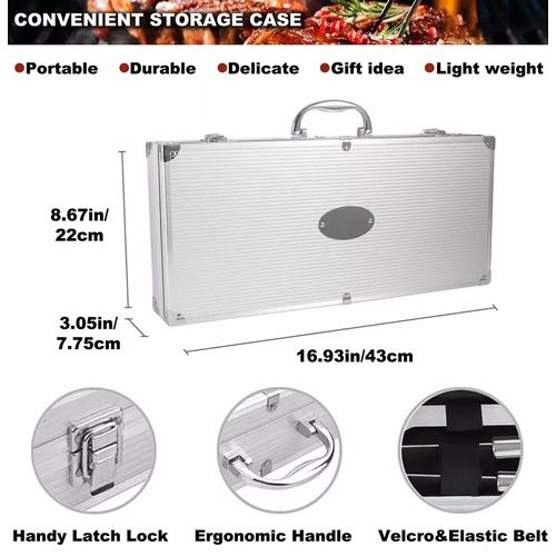 A Perfectly Cooked Meal Requires a Perfect Barbecue Grilling Tools Set. Everything You Need In One BBQ Accessories Set Start grilling with 26pcs complete BBQ tool set to meet all your BBQ needs, you will not bother anymore to choose the grilling utensils. Complete with durable barbecue utensils such as 4-in-1 spatula, tongs, skewers, grill brush and more, each grill accessory has been chosen with a purpose to complement your dishes and make grilling more easier. Professional Safety Quality For Years Of Use Every barbecue tool needed to make the tasty recipe is included in this exclusive grill kit. Each of the accessory is made from high quality grade stainless steel which will not breaking over time. The BBQ tools come with an ergonomic design handle and hanging hook to leave you the wonderful barbecue experience. Enjoy An Impeccable Grilling Time Together Whether you need to get dinner for your family this week or are planning your next get-together with friends, the comprehensive barbecue utensil kit has everything you need to rustle up your favourite recipes. There’s nothing more fun than sharing a special moment together during Holidays, Thanksgiving or Anniversary Celebration with red wine and meats. Share the Perfect Grill Gift and Make a Very Perfect Moment The giving and receiving of gifts with someone you love is a special way to show how much we care for each other during a sweet moment. Now find here, with heart and passion, an ideal grill gift made specially for your family and friends. Our grill accessories set with delicate case must be the greatest bbq gift set on Birthday, Saint Valentine’s Day, Fathers Day, Mothers Day, Christmas Day.