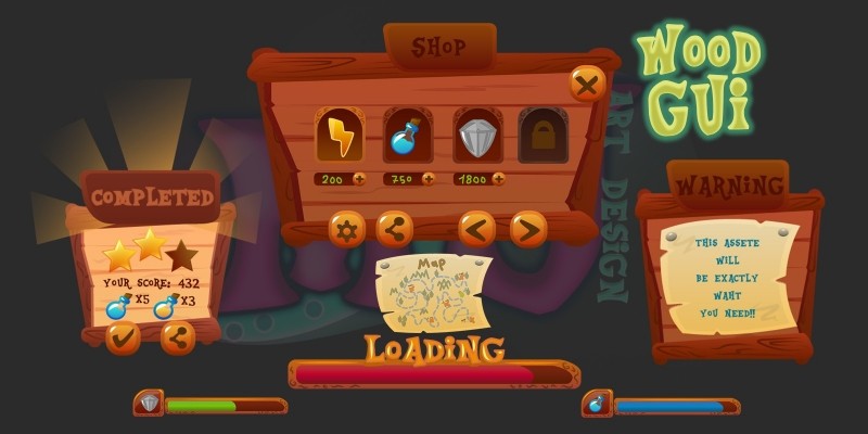 2D Game Wood GUI Kit. high quality