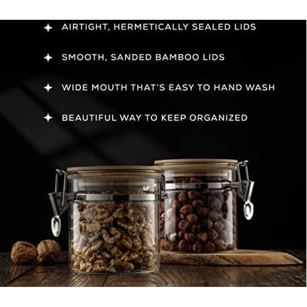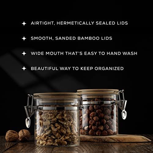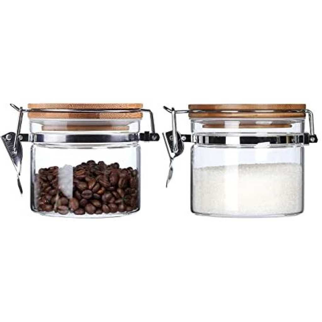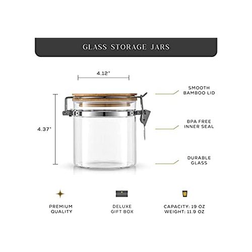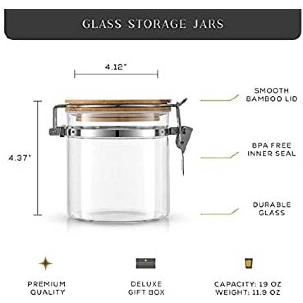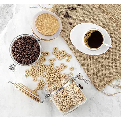 2PC Airtight Storage Pantry Food Glass Jars with Bamboo Clamp Lids- Clear. Why hide your pantry items behind closed doors when these modern glass containers with bamboo lids add understated style to your kitchen? They won’t hold large quantities like a full flour jar, but they’re perfect as a nuts container, herb container, or small candy jar for display or kitchen storage. Some glass pantry storage containers with lids only provide one thing but these glass jars with wood lids are both beautiful and functional in your pantry. The star of the show is the hermetically sealed clamp lock and BPA-free seal that keeps your food fresher than ever while preventing odors from escaping. In fact, we couldn’t make them any more airtight! The JoyJolt Clamp Lock kitchen canisters range comes in 12 fl oz, 19 fl oz, and 27 fl oz. So whether it’s lentils or pasta, coffee or tea, there’s a kitchen jar to fit your food! Can’t find the motivation to get organized? These glass jars with wood lids will inspire you to get started today. Herb containers, coffee jars, or salt jars! Unleash your inner Marie Kondo with tidy rows of matching glass storage jars and remember to take a social media-worthy photo of your newly organized pantry! This glass jar with bamboo lid 2pc set makes a lovely and practical gift. Gifts for women, gifts for men, gifts for mom, or gifts for anyone with a kitchen! Bring them organizational joy with Jars by JoyJolt! • 2 Borosilicate Glass Jars with Airtight Bamboo Lids • 4.12” wide, 3.25” tall • 12, 19, or 27 fl oz capacity • Airtight, Hermetically Sealed Lids • Lightweight, but Durable • Easy To Clean: Wide mouth that’s easy to hand wash • Gift Boxed with Secure Padding Key Features: 2PC Airtight Storage Pantry Food Glass Jars with Bamboo Clamp Lids- Clear. 2 Borosilicate Glass Jars with Airtight Bamboo Lids ● 4.12” wide, 4.37” tall ● 19 fl oz capacity ● Airtight, Hermetically Sealed Lids ● Lightweight, but Durable ● Easy To Clean: Wide mouth that’s easy to hand wash ● Gift Boxed with Secure Padding