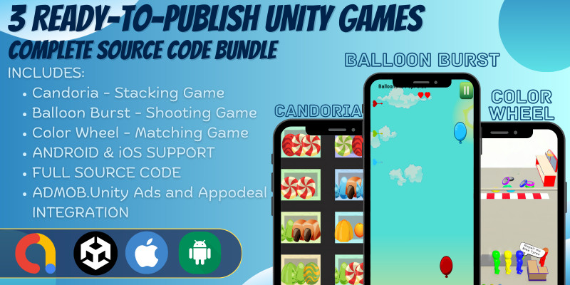 3-in-1 Unity Casual Game Bundle. Bundle of 3 Unity games: candy stacking, balloon popping, fast matching. Full C# source code with AdMob. Ready for Android and iOS