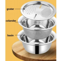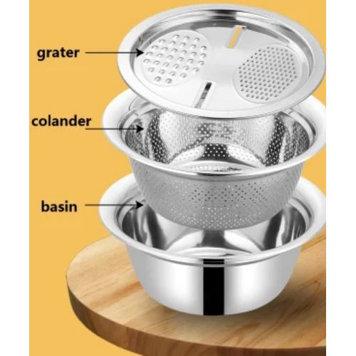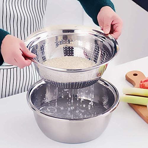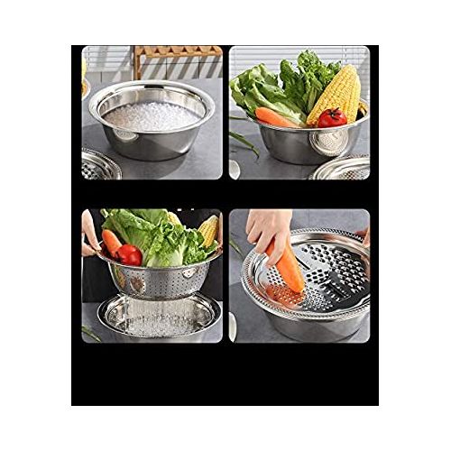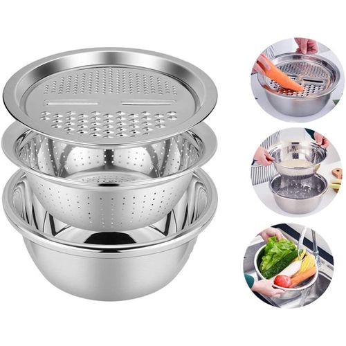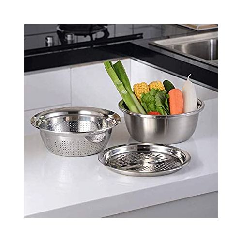 3 In1 Colander Basin, Grater Strainer and Drain Basket Salad Bowl, Silver. 【Efficient Kitchen Tools】MIFXIN new 3pcs colander set includes 1 fine strainer, 1 basin and 1 julienne peeler. 3-in-1 kitchen colander & bowl set. Using it for washing, rinsing, shredding. A good helper for kitchen and used in most fruits, vegetable, food. 【Premium Safe Material】Colander strainer set made of 304 stainless steel, can largely avoid rust and dyeing caused by food residues and kitchen grease stains, safe, healthy and durable enough. 【Multi-Funciton】Space saving design includes colander with holes for straining and outer bowl for retaining liquids and water. It also works for mixing cold salad, noodles, draining most food like spaghetti, pasta, potatoes, broccoli, green beans, carrots, spinach and other veggies. 【Caring Design】Widened and extended edge makes the colander and basin feel comfortable, handy, not easy to slip for wet by water, while increasing the draining space, accelerating the speed, an essential kitchen gadget. 【Large Size】Sink strainer: Outer diameter 286mm, depth 96mm. Basin: Outer diameter 280mm, depth 160mm. Julienne peeler: Diameter 265mm. Reasonable size and user-friendly design makes it easy to wash food fruits and vegetables.