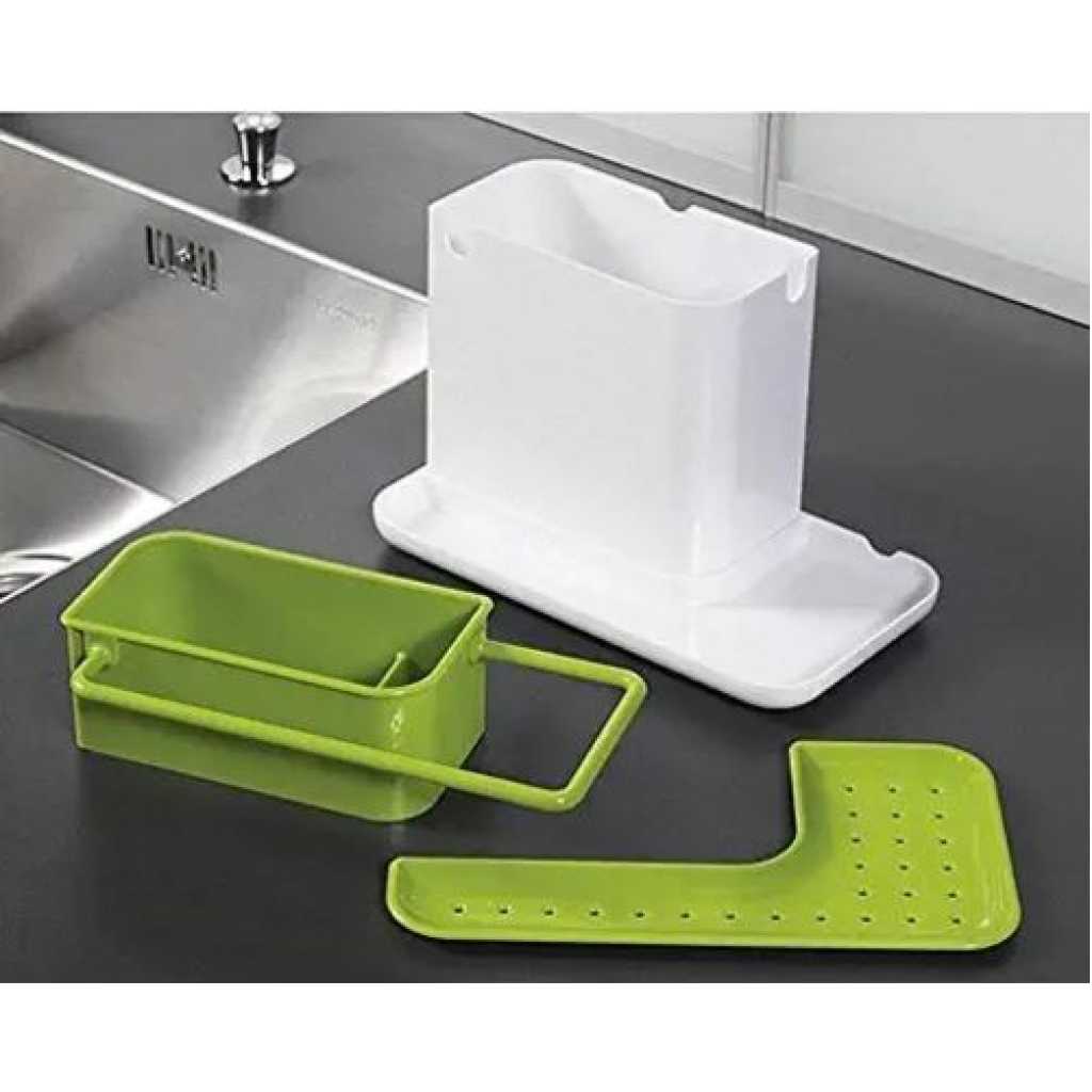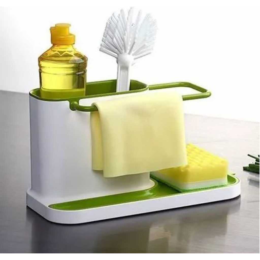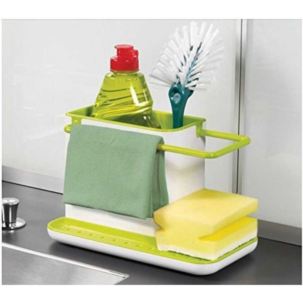 Key Features: 3 in1 Kitchen Sink Organizer Stand Draining Holder Towel Soap Brush Sponge Rack- Green The washing up has never been so organized with this highly innovative design. Organise storage space with ease for the sink area Integrated drainer for clothes and sponges Color: May Vary, Material: Plastic Package Includes: 1 x 3 in-1 kitchen drainer