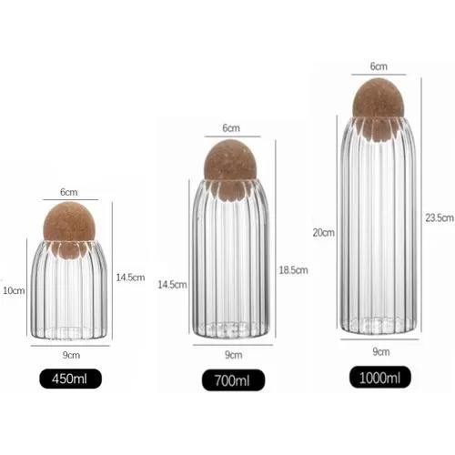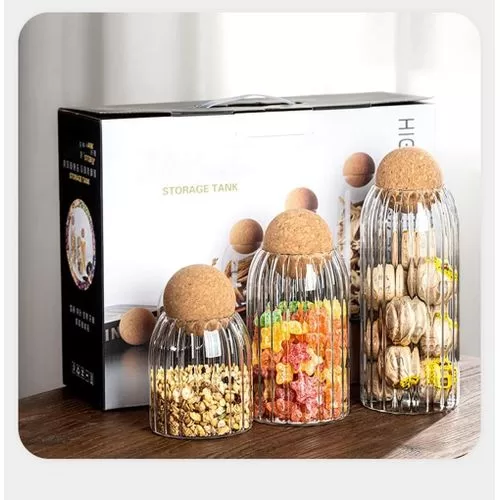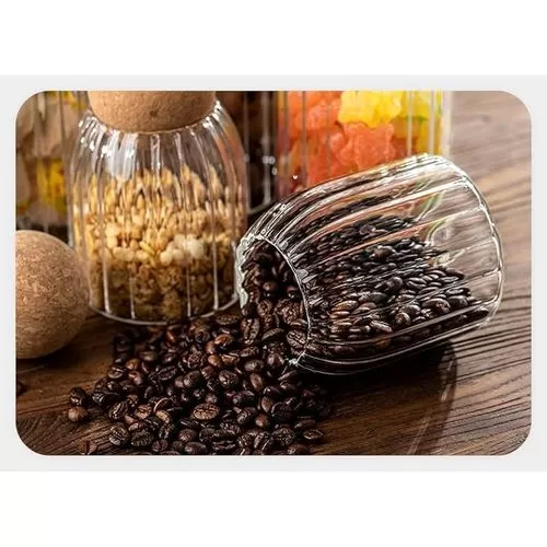 Key Features: ????The storage container is made of high quality glasses, which is more thinner, lighter, capable of withstanding thermal shock,The smooth cork stopper is made from eco-friendly natural wood. ????The storage bottle with a flexible cork cover effectively keeps the air and moisture out, creating a moistureproof environment to keep your food inside clean and fresh. ????The ribbed design is sure to add style and class to your kitchen, conveniently making it easier to pick up the jars while looking better than a standard glass jar. Great for displaying more than just your dry food, show off some stunning stones or store your favourite bath salts in these jars. ????These glass storage canisters with streamlined design are exquisite, great durability. It’s ideal for storing sugar, rice, cereals, nuts, beans, snacks, pasta, coffee and tea, espresso, snacks, preserves, jams, chutneys, flour, spices, cookies, seasonings, and fresh handicrafts, bathroom supplies.