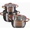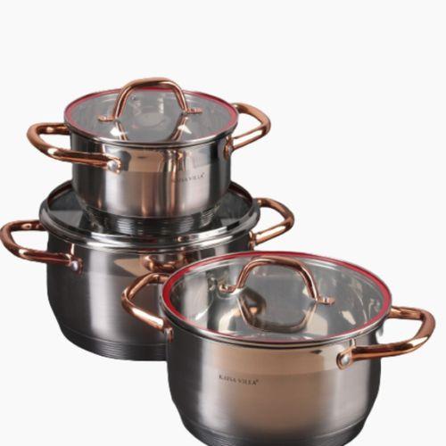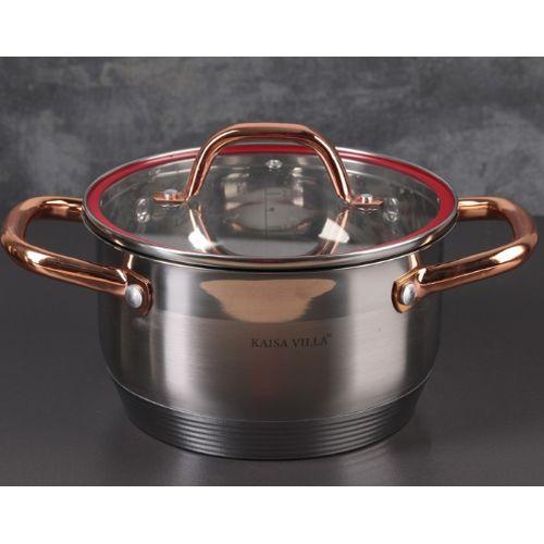 3 Piece Stainless Steel Saucepans/Cookware Pots- Silver Set of pots Kaisa Villa Mystery Mini 3 pots with heat-resistant glass lids. A set of pots made of stainless steel with a thick, multi-layer capsule-type bottom. The Mystery Mini pans can be used on any type of hob, including induction. The outer surface of the pots is matted, along the top there is a mirror strip. Heat-resistant glass covers are equipped with a steam outlet, along the edge of the reinforced stainless steel rim to prevent chipping. You can use a dishwasher for washing. The set includes three pots, full volume: 2.1L (Ø16×10.5cm), 2.9L (Ø18×11.5cm) and 4L (Ø20×13.5cm). The set is packed in an individual print-box. Care Any dish detergents. Do not wash with abrasive abrasives. Do not use metallized or hard wipes or brushes
