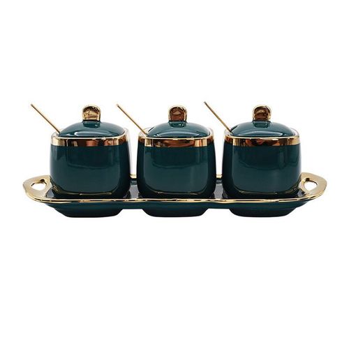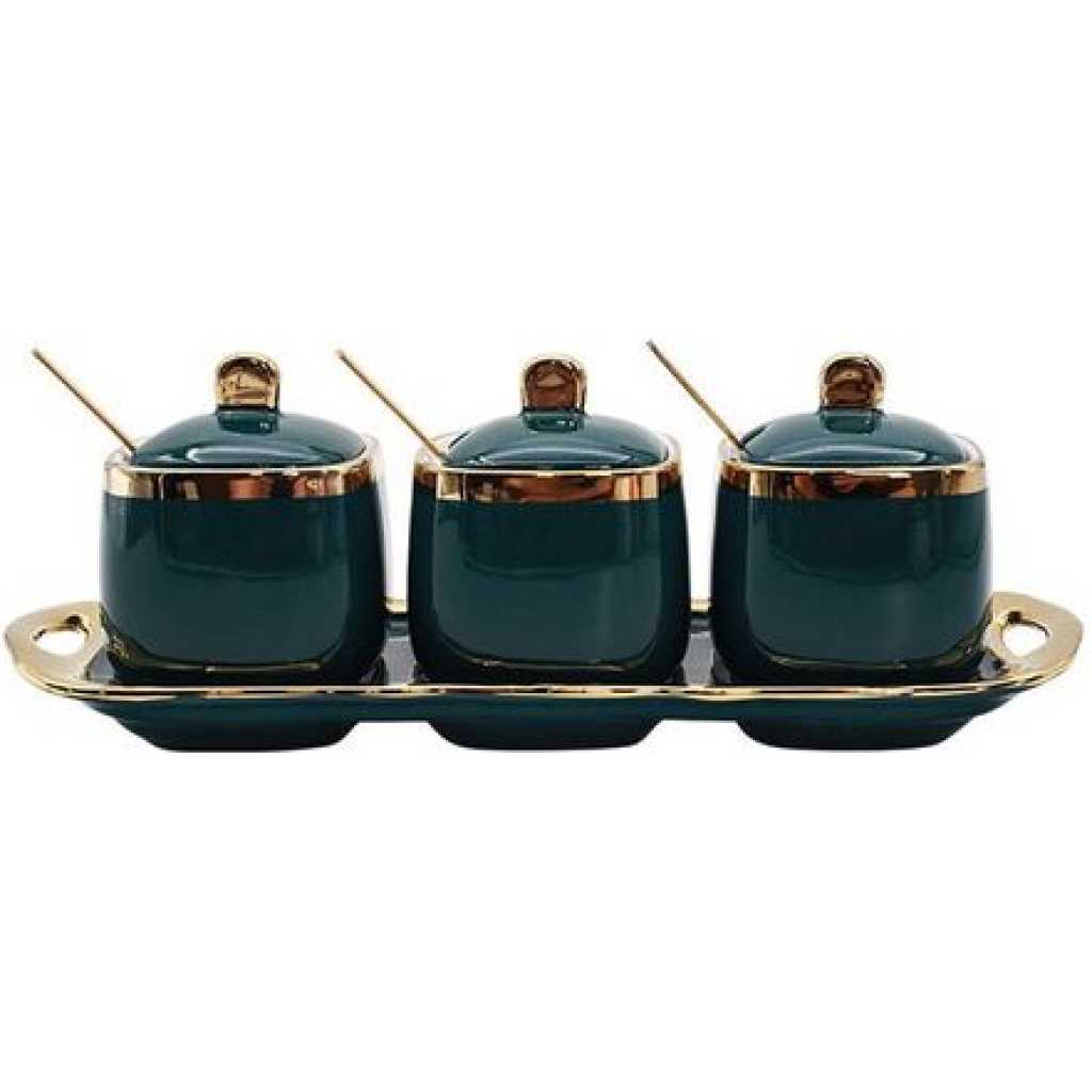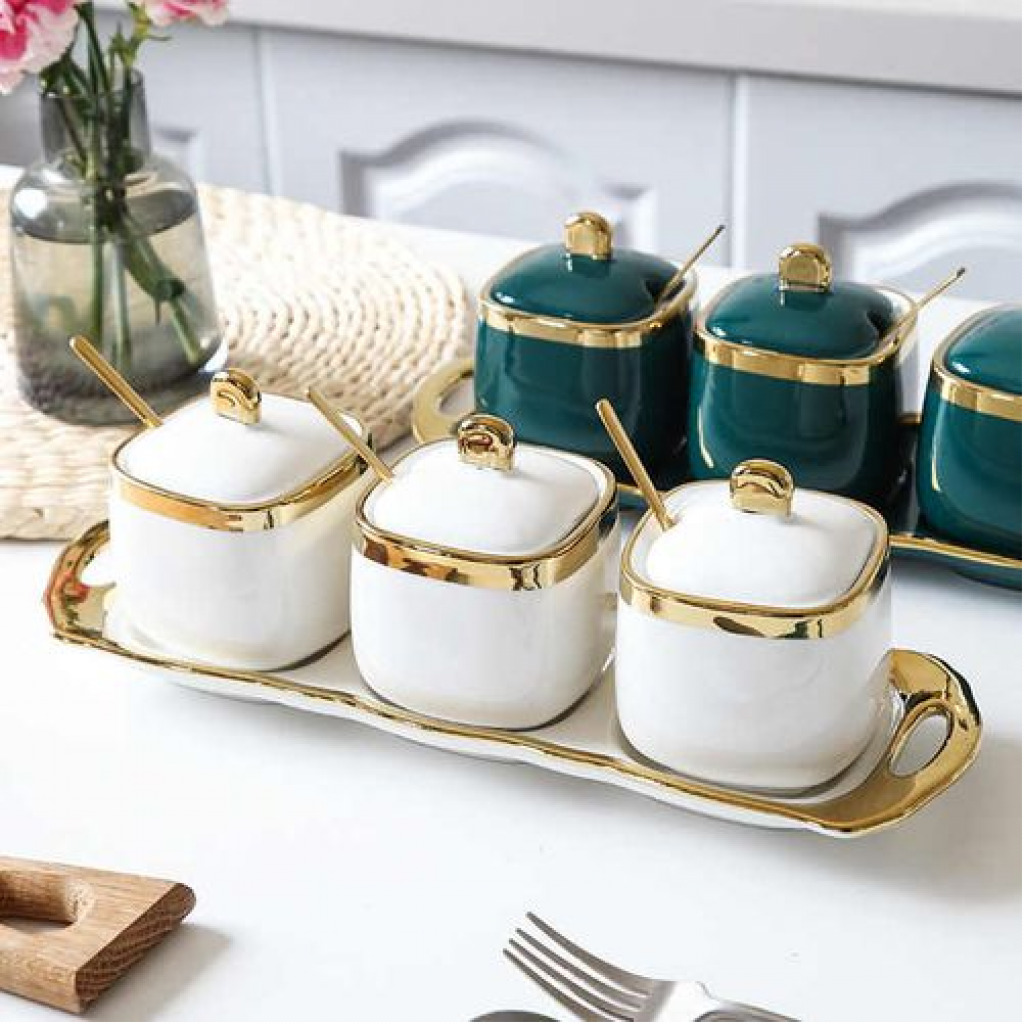 The perfect blend of beauty and utility, this Three-piece ceramic jar set is what you need to store your items attractively in your kitchen. The Set contains 3 spoons, 3 jars with lid and one tray. STYLE & VERSATILITY – Whether giving as a gift or using in your own home, these modern inspired canisters are offer the perfect blend of style and sophistication along with terrific versatility, these containers will surely add charm to any kitchen KEEPS CONTENTS FRESH AND DRY – Ceramic lid creating an airtight environment to keep contents dry, fresh, and free from insects or odors. SIMPLE, SOPHISTICATED, FUNCTIONAL – Set of 3 Jar with inspired canisters for sugar, tea and coffee only. MATERIAL AND CARE TIPS – Heavy duty ceramics are dishwasher safe. Its Dimensions are box dimension:- length: 12cm, breadth: 28 cm, height:12 cm, weight: 0.255 kg Jars