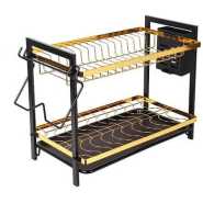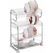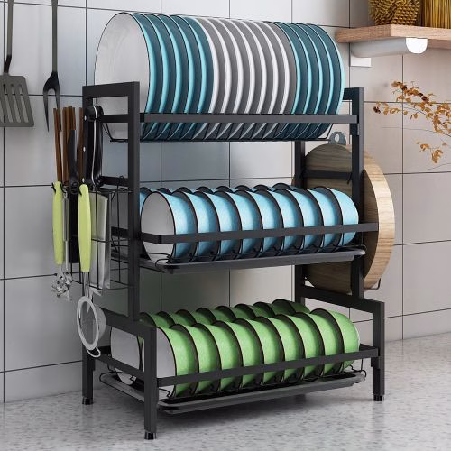 Tumoral Dish Drying Rack is a Perfect Kitchen Space Saver for you! An elegant 3-tier dish rack to organize your plates, cups, glasses, and utensils is a must-have in every kitchen. The upper tier can place up to 17 plates, the lower tier can place up to 18 bowls; The 2 sides are used for hanging cutting boards and utensils, keep your kitchen organized. Product Features: Material: Premium 304 Stainless Steel, Rustproof and Long Lasting Dimension: Length X Width X Height:16.7 inch X 10 inch X 15.3 inch Distance from the lower rack to the first drain tray: 8 inches Easy To Assemble: This space-saving dish rack is very easy to assemble, we provide installation instructions for your reference and operation.
