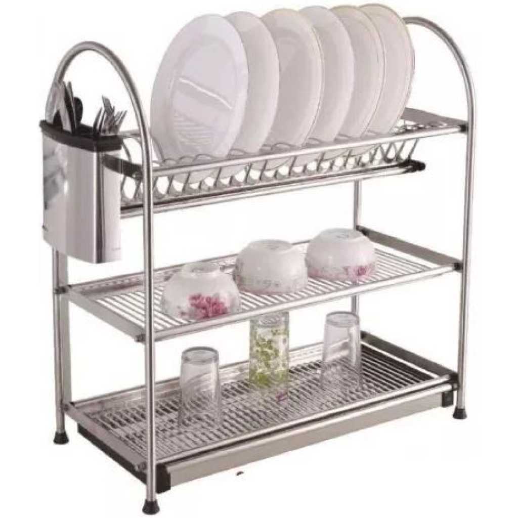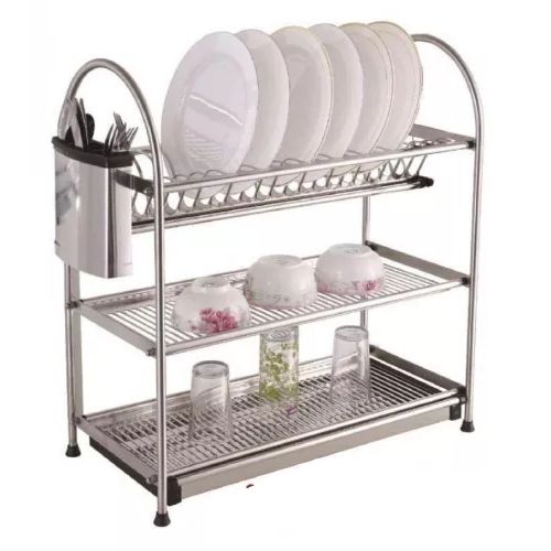 Key Features: 3-Tier Dish Drying Rack Dish Drainer Kitchen Stainless Steel Storage Stand- Silver. Made from high-quality aluminum material Durable and will never rust Comes with removable plastic drip trays Keep your dishes, glasses, and utensils properly organize It helps to keep your kitchen area clean and tidy It is very simple to use and clean