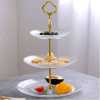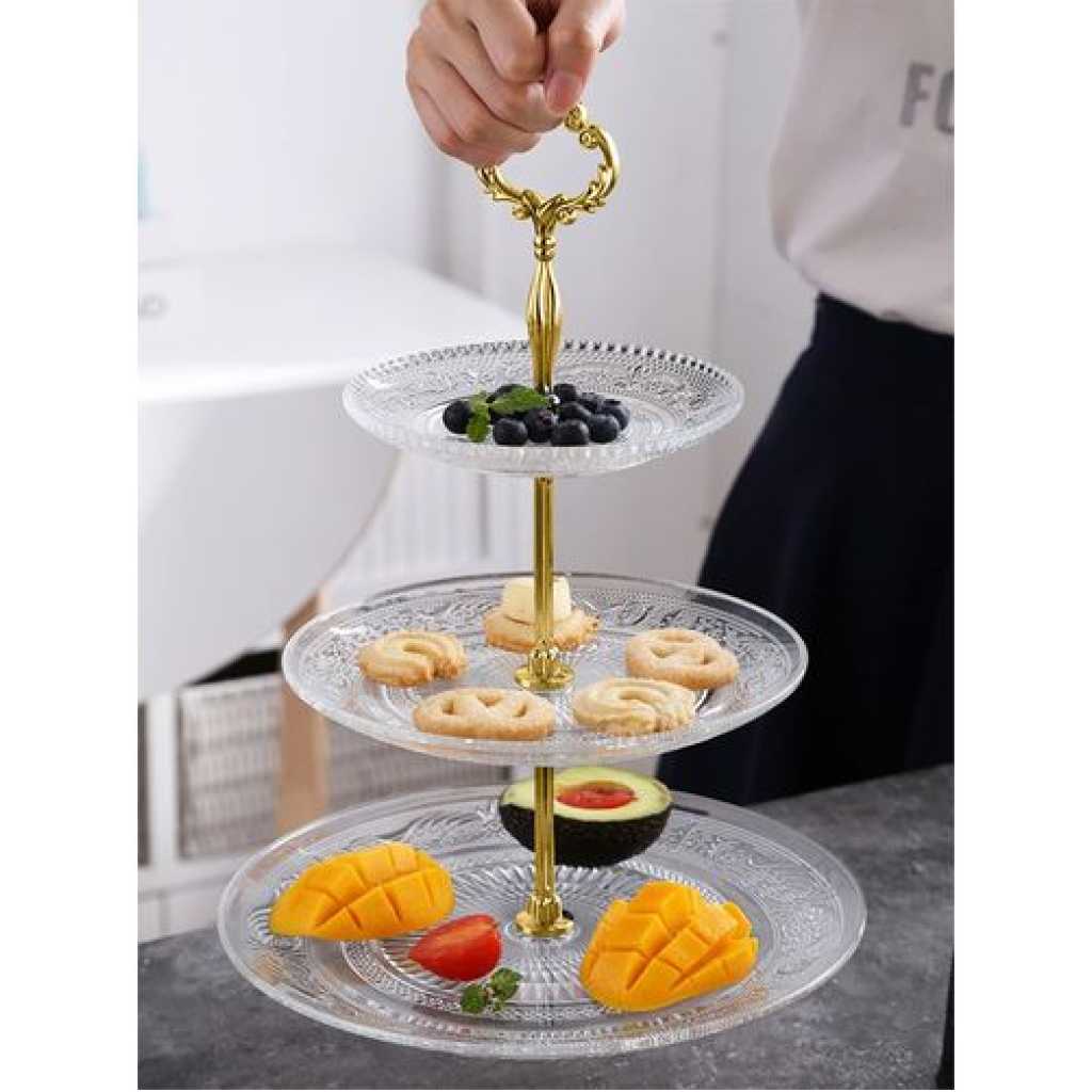 Key Features: 3-Tier Glass Cake Stand Serving Tray Tower Dessert Holder Pastry Serving Platter Display Decoration- Clear. Three-Tier Serving Dish Intricate Detailing Brass Metal Rod with Carry Circle Durable Borosilicate Glass Stain and Odor Resistant Handwash Recommended Glass embossed design and a golden crown. Gold-plated handle, smooth and scratch-free edges. Easy assembly, disassembly, and cleaning. Space-saving and two choices for 2-tier and 3-tier. Perfect gift, use at weddings, tea parties, baby showers, or birthdays
