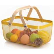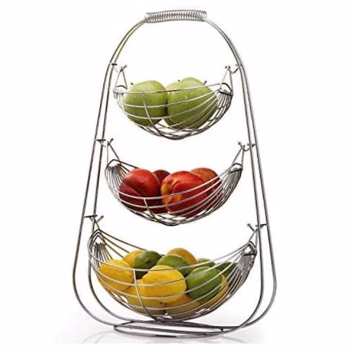 3 Tier fruit basket rack. This stunning 3-tier silver triple swinging produce basket rack provides unparalleled air circulation to help keep your fruits and vegetables fresher longer. The sturdy metal design makes for ideal pantry storage or an attractive centerpiece for your counter top, and the lovely hammock design of the baskets provide an artistic way to display your fruits, potatoes, onions, tomatoes, lemons, apples, oranges, banana and more. Approximate Dimensions (in inches): 20.5 H x 18.0 W x 11.0 D