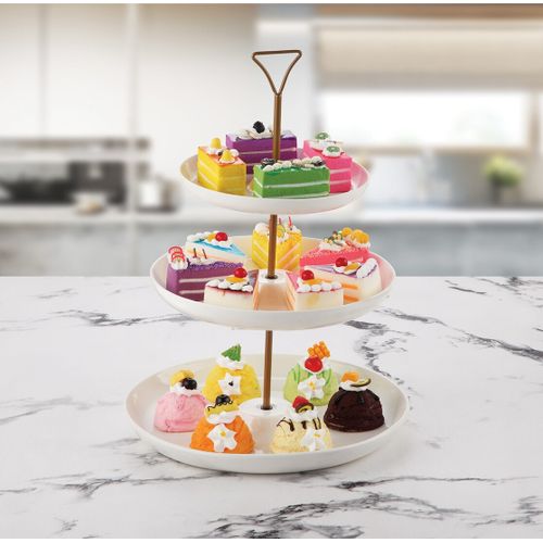 Always make the most of every party or event by sharing and displaying treats, snacks, cakes, cookies, or cupcakes with beautifully elegant style! Whether you love hosting friends, celebrating holidays with extended family, or you’re a realtor who just wants to create a warm, welcoming atmosphere at an open house, there’s nothing like sharing appetizers, snacks, or treats with classic style and accessibility. That’s why we created the Fisher Home Products 3-Tiered Serving Dish, an elegant glass serving stand that features three round plates in different sizes to better suit your hosting or presentation needs. Perfect for holiday events, business gatherings, or personal parties, these gorgeous glass dishes give you more versatility in both your display and snacking convenience. Offering 360° access to your fruits, pastries, or candies, as well as better portability for use in the kitchen, dining room, or backyard table, it’s truly perfect for every occasion. Key Features: Three Tier Serving Dish Intricate Detailing Brass Metal Rod with Carry Circle Stain and Odor Resistant Handwash Recommended Great for all occasions Ideal for holiday parties, weddings, birthdays and other events Porcelain are dishwasher and microwave safe Plates Dimension: 18cm, 23cm and 28cm