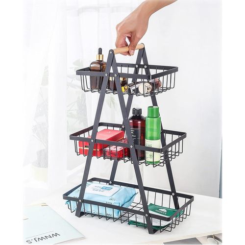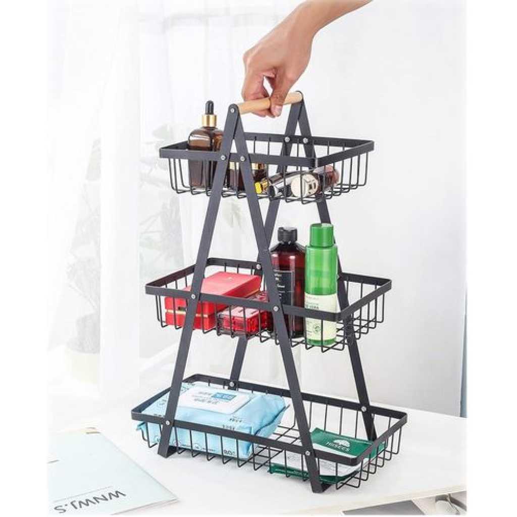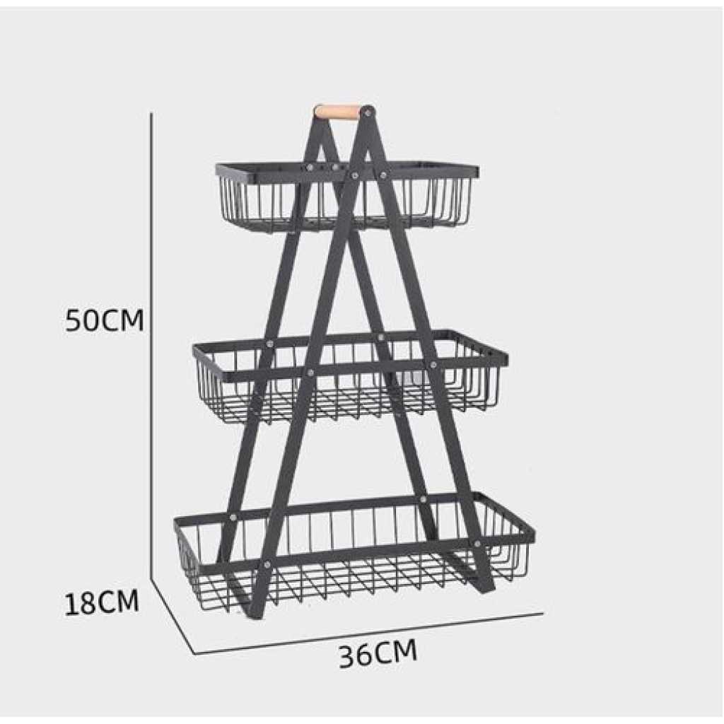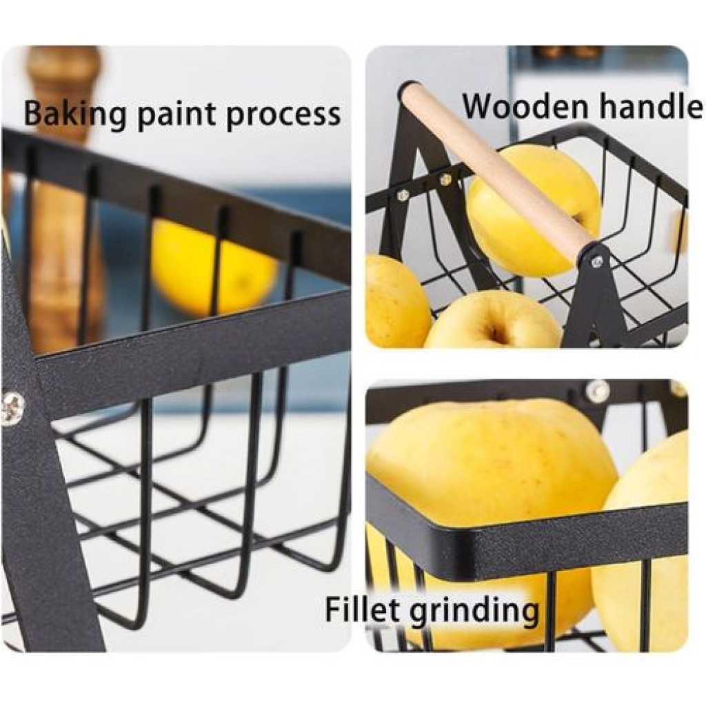 3 Tier Portable Fruit Basket Stand Vegetable Bread & Snacks Detachable Metal Rectangle Basket With Wooden Handle Modern for Kitchen Decoration- Black Convenient Removable Design and Sturdy Structure: This fruit bowl features a detachable design, allowing each layer to be easily disassembled. The structure is stable and durable, providing a reliable foundation. You have the flexibility to freely combine the layers, creating a versatile 3-tier basket. Installation is quick and hassle-free, saving you time and effort. Stable and Secure Design: Crafted from carbon steel, this basket is rust-proof and designed to be thickened for enhanced beauty and durability. Equipped with a convenient wooden handle, it enables easy transportation of goods from the pantry to the dining table. The basket promotes air circulation, keeping your fruits and vegetables fresh. It is suitable for use on kitchen counters and in restaurants. Multi-Purpose Functionality: Not only is this basket perfect for storing fruits, but it can also serve as a vegetable basket, bread basket, snack basket, and more. It effectively saves space and eliminates desktop clutter. Additionally, it makes for an excellent gift choice. The characteristic wooden handle provides a comfortable grip and makes it easy to carry, making it suitable for camping, picnics, and barbecues. Space-Saving Solution: Designed specifically for holding fruits and vegetables, this basket helps maintain a neat and orderly space. Its open design allows for easy cleaning and ensures simplicity without adding bulk. By placing it on your kitchen counter, dining room table, or even in the bathroom, you can save valuable space and add a decorative touch to your home. It also makes a wonderful gift for family and friends. Fruit Basket 3 Tier Black – With dimensions of approximately 36*18*51 CM, this black 3-tier fruit basket provides ample storage space for your fruits while saving valuable countertop space. Its stylish and compact design keeps your fruits fresh and neatly organized, adding a touch of elegance to your kitchen.