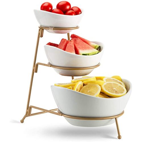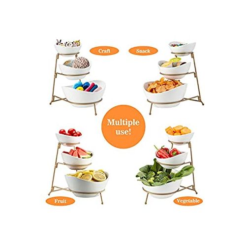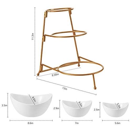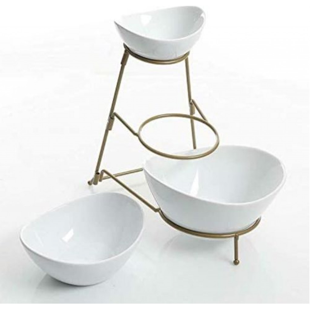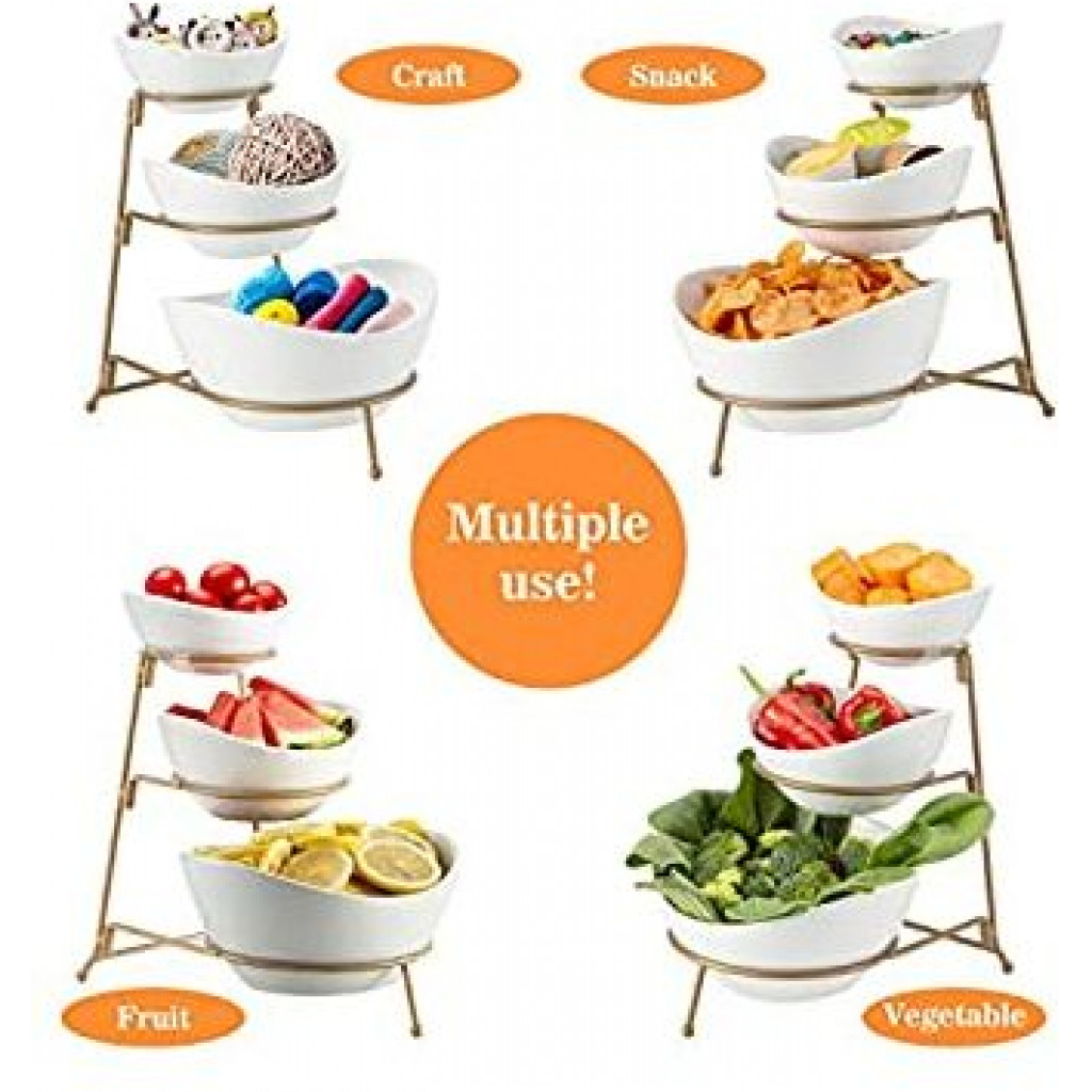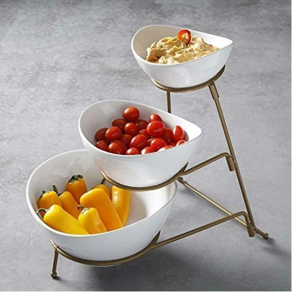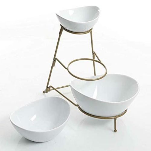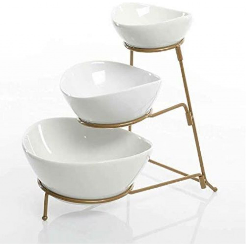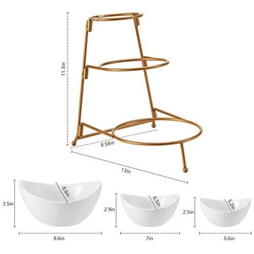 Count on it to add an elegant touch to parties, showers, receptions, buffets, dinners & everyday! Load up your serving stand with fruits & veggies and set on your kitchen counter. OR use the bowls separately to serve dinner entrees & sides. Easy to clean and store. When you’re finished, simply disassemble the stand for storage in a drawer or cabinet. Small Bowl Dimensions: 5.6 ” ×5.2 ”×2.5” Medium Bowl Measures: 6.25″ x 5.25″x3.25″ Large Bowl Measures: 8.25″ x 7.25″x 4″ Collapsible Metal Stand:13 ”×8.58”×11.3” Package include: 3 Piece of serving bowl set pack with metal rack Key Features: GREAT SERVE WARE: Great serve ware: Separate your favorite chips, snacks, and dips for your guest to enjoy. EASY TO STORE: Collapsible metal stand and stackable porcelain bowls. Tiered bowls allows for different dips without taking too much table space. MODERN LOOK: Perfect for serving and entertaining for any occasion, elegant and versatile design. DISHWASHER SAFE: Ceramic is microwave and dishwasher safe metal rack is hand wash only. SET INCLUDES: 1pc: 5 inch bowl – 1pc: 6.25 inch bowl – 1 pc: 7.5 inch bowl – 1 pc: Metal stand