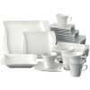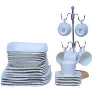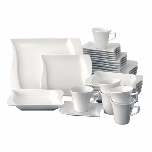 The Simple Plain White 30 Piece Rectangle Dinner Set is part of the break and chip resistant clay dinnerware, allowing it to stand up to the rigours of everyday life and still look great. Slick Rectangle shapes with square corners and flared rims fuse perfectly with the traditional Rectangle inside, resulting in a totally fresh but timeless look. Versatile enough for everyday and entertaining! Key Features: 30-piece set; service for 6 Dinner plates, side plates, bowls, saucer, and cups Porcelain Rectangle dinnerware is microwave oven safe to 450 degrees Dishwasher safe for easy cleanup 100 percent Porcelain