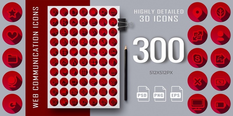 300 3D Red Web Communication Icons Set . 300 3D Web Communication Icons Set,Perspective with Shadow in Red Color.
